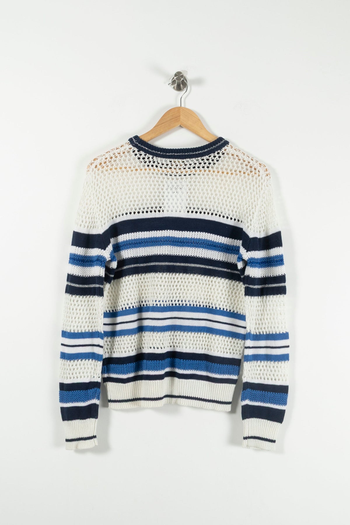 Pull rayé multicolore en maille ajourée Bérénice, taille M/38, parfait pour une allure décontractée et tendance. Confectionné en 55% lin et 45% coton, ce pull se distingue par sa matière légère et aérée, ainsi que ses rayures aux nuances de bleu et blanc qui lui apportent une touche raffinée et moderne. Idéal pour une promenade en bord de mer ou une sortie printanière, associé à un pantalon clair et des accessoires casual.
