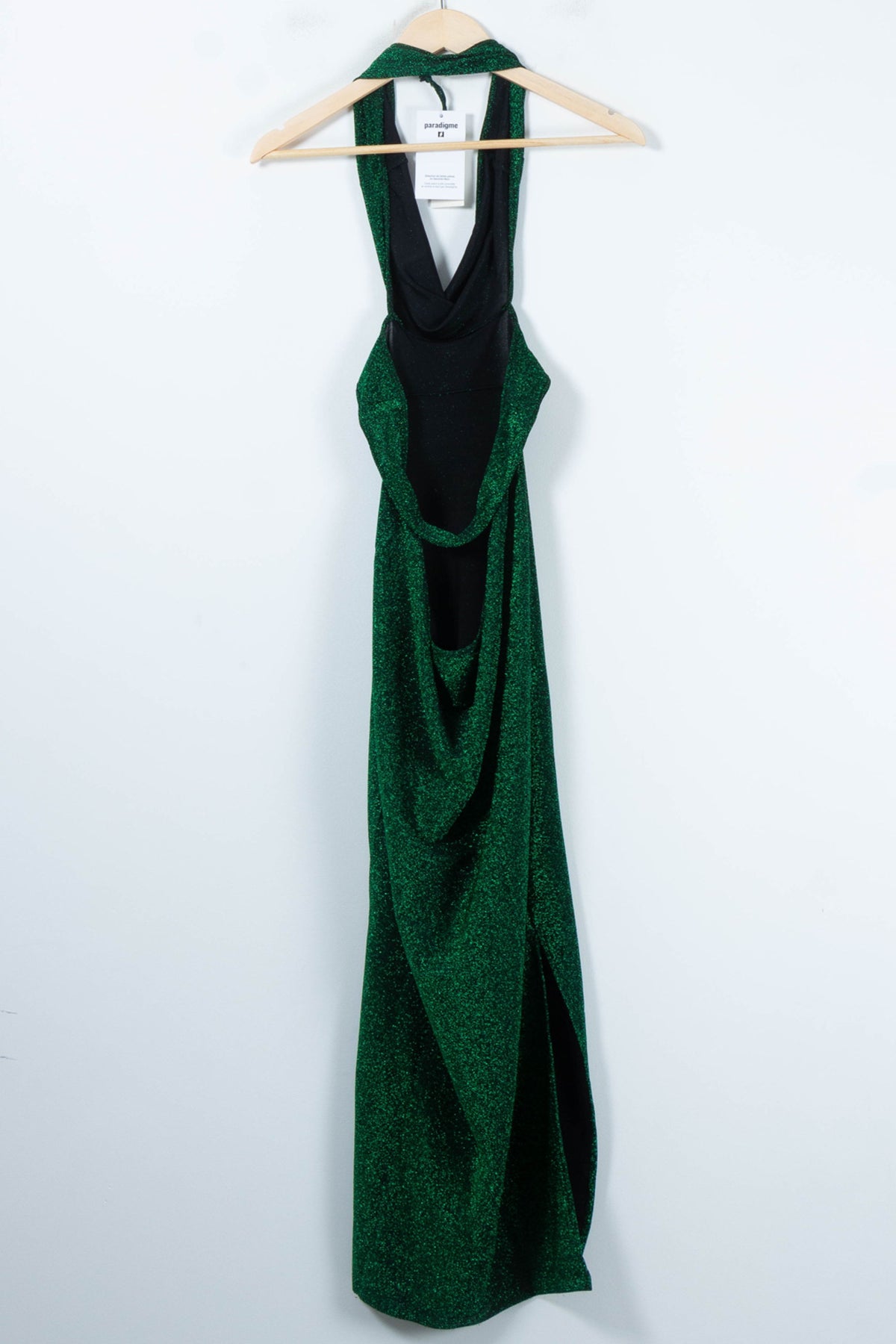 Robe longue émeraude Karma Koma, taille M/38, à l’élégant décolleté drapé, confectionnée dans une matière fluide et scintillante. Composée de 62% polyamide, 35% lurex et 3% élasthanne, cette pièce se distingue par son effet pailleté sophistiqué qui souligne la singularité de sa coupe et garantit un confort remarquable. Idéale pour une soirée élégante ou pour illuminer un événement festif avec raffinement.