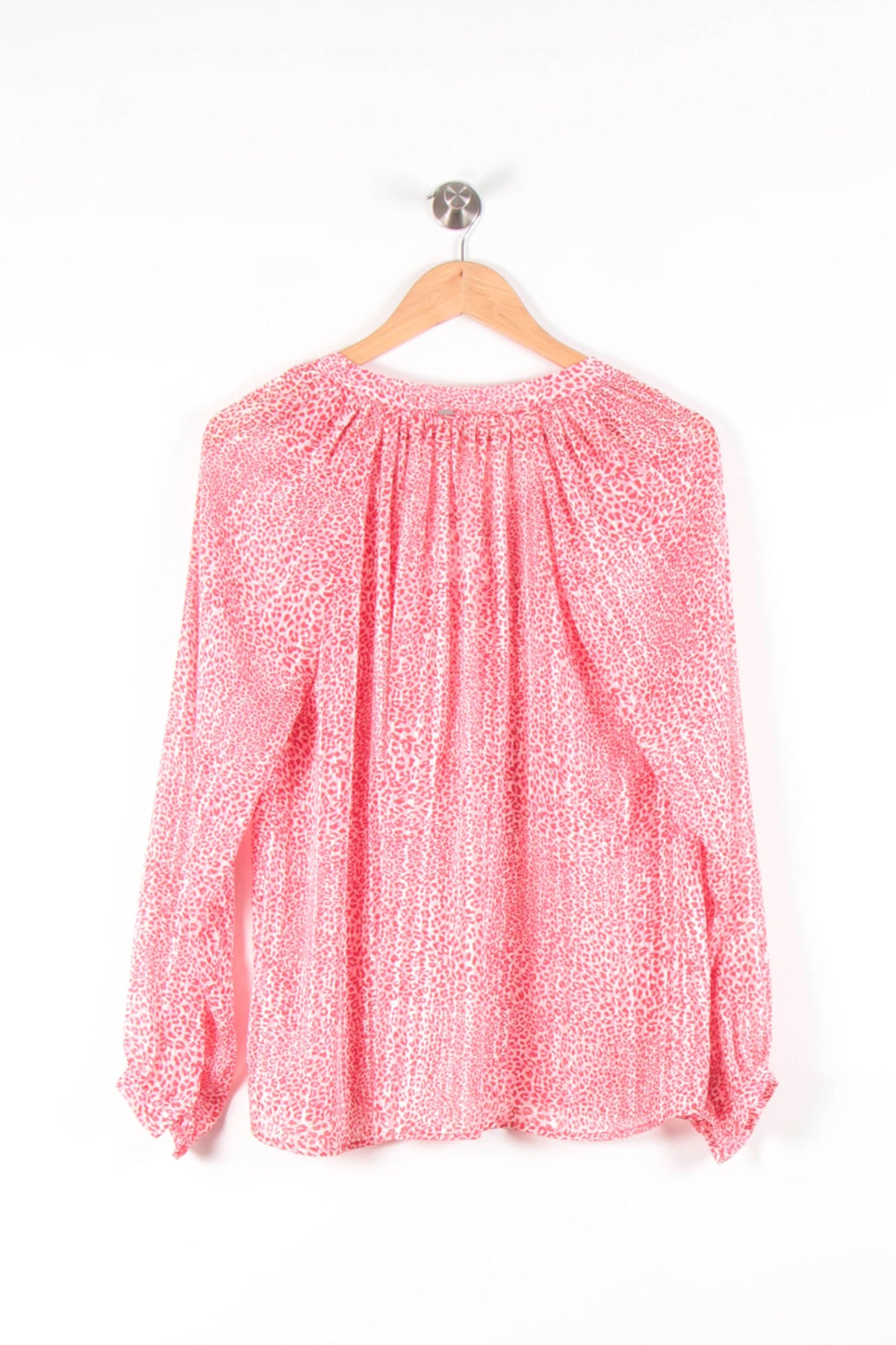 Top IKKS femme taille S/36, de couleur rose, à motif imprimé léger et encolure en V. Confectionné dans une matière fluide, il possède des manches longues finies par un lien noué, ce qui lui apporte une touche de féminité et distingue ce modèle. Idéal pour un déjeuner entre amies ou une sortie citadine au printemps.