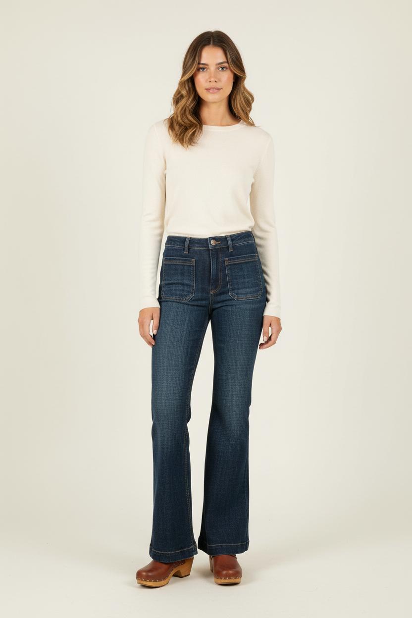 Jean bleu évasé Bérénice, taille S/36, alliant élégance et modernité à travers une coupe flatteuse. Confectionné dans une toile denim bleu profond, ce pantalon se distingue par ses poches plaquées à l'avant et sa finition surpiquée, qui lui confèrent un charme authentique et contemporain. Parfait pour une journée au bureau avec une chemise fluide ou pour un week-end décontracté en ville.