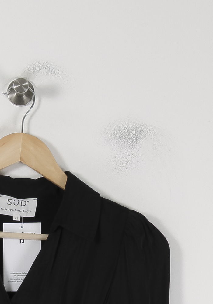 Robe noire Sud express, taille XS/34, à manches longues et col chemise, idéale pour une silhouette élégante et intemporelle. Confectionnée dans un tissu principal 100% polyester avec une doublure 100% viscose, cette robe séduit par sa texture fluide et son décolleté croisé, sublimé par des poignets boutonnés et une coupe délicatement structurée. Parfaite pour une soirée habillée, un dîner ou un événement professionnel nécessitant une allure raffinée.