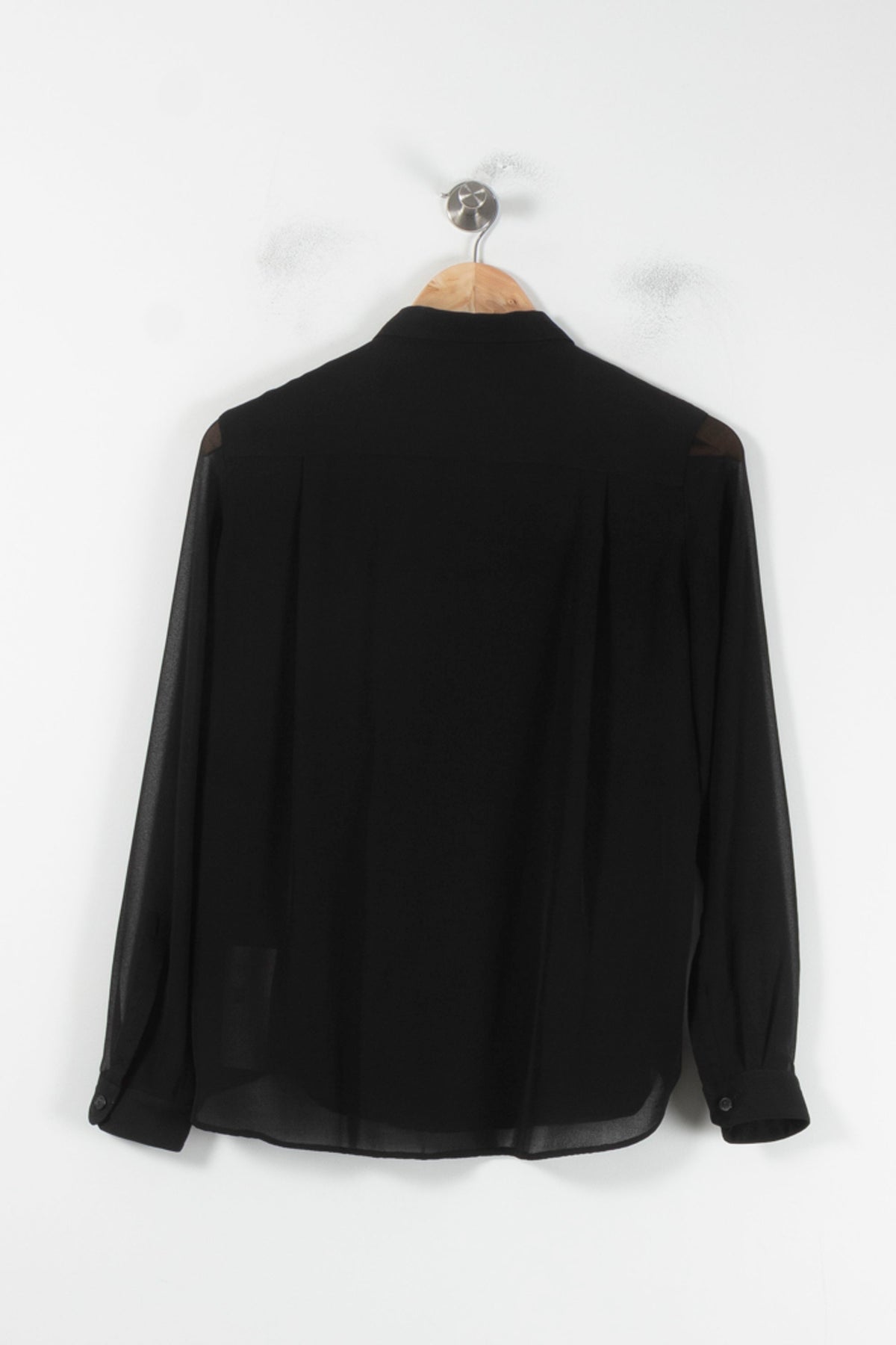 Blouse noire The Kooples, taille S/36, ornée de broderies florales sur le devant, idéale pour sublimer vos tops. Confectionnée en 100% polyester, cette pièce légère se distingue par ses manches transparentes et ses motifs brodés qui ajoutent une touche d’élégance unique à l’ensemble. Parfaite pour une soirée habillée ou un dîner raffiné, cette blouse apportera une note sophistiquée à votre tenue.