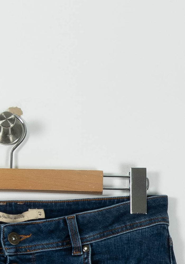Jean bleu coupe évasée La Fée Maraboutée, taille XL/42, parfait pour une allure élégante et décontractée. Confectionné dans un mélange de 65% coton et 35% polyester, ce jean offre une texture douce et résistante avec une fermeture à boutons visibles qui lui confère une touche d’originalité. Idéal à porter lors d’une sortie entre amis ou pour une journée de travail décontractée.