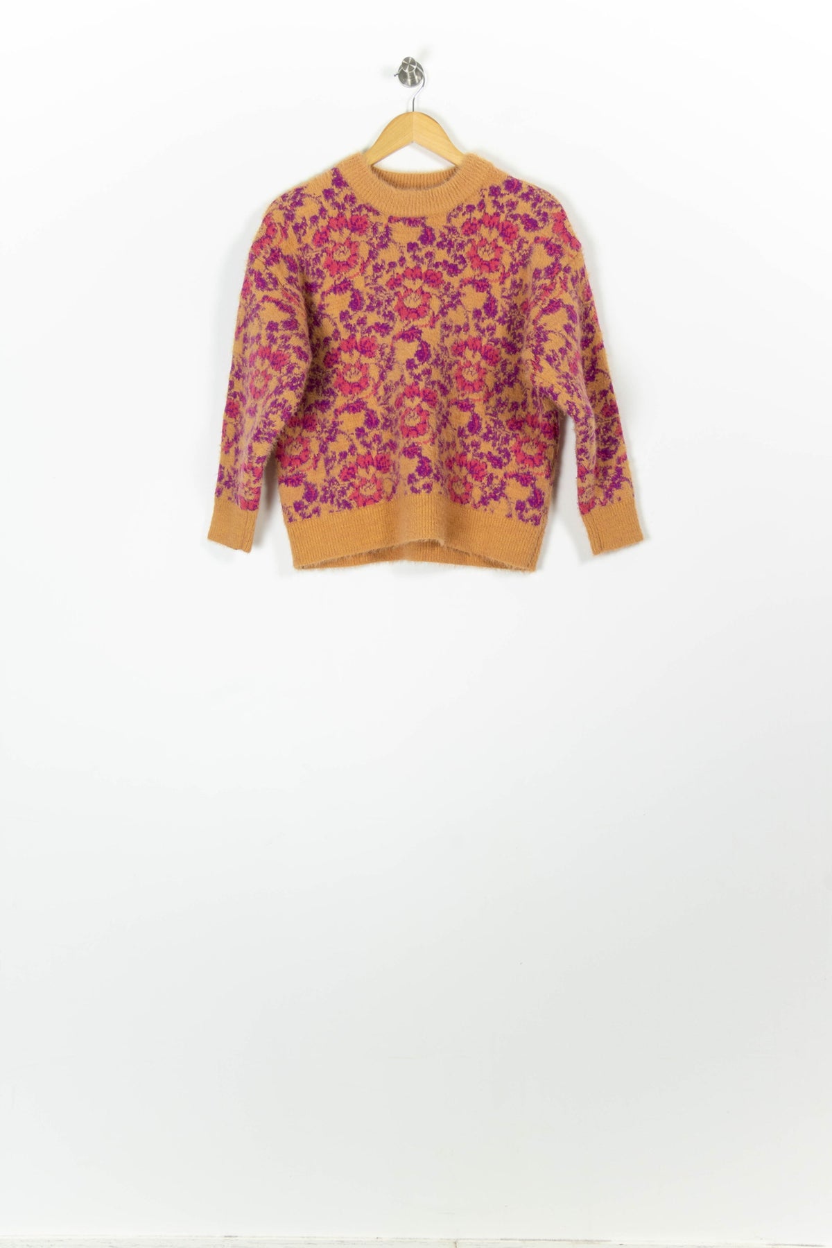 Pull multicolore à motif floral FRNCH, taille S/36, parfait pour une touche colorée et sophistiquée dans votre garde-robe. Conçu en maille douce composée de 65% acrylique et 35% polyamide, ce pull séduit par son motif floral rose et violet sur fond camel, apportant originalité et chaleur à chaque tenue. Idéal à porter lors d'une sortie décontractée entre amis ou lors d'une journée cocooning cet automne.