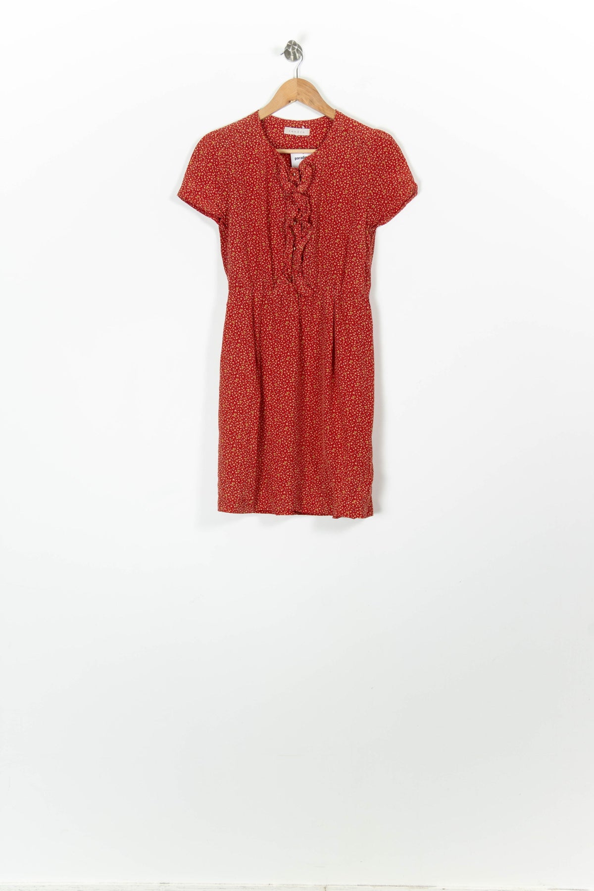Robe courte Sandro rouge à imprimé fleuri, taille S/36, élégante et féminine. Confectionnée en 100% soie, elle séduit par son toucher délicat et ses détails de volants sur le devant, qui apportent une touche raffinée et originale. Idéale pour une garden-party estivale ou un déjeuner élégant en ville.