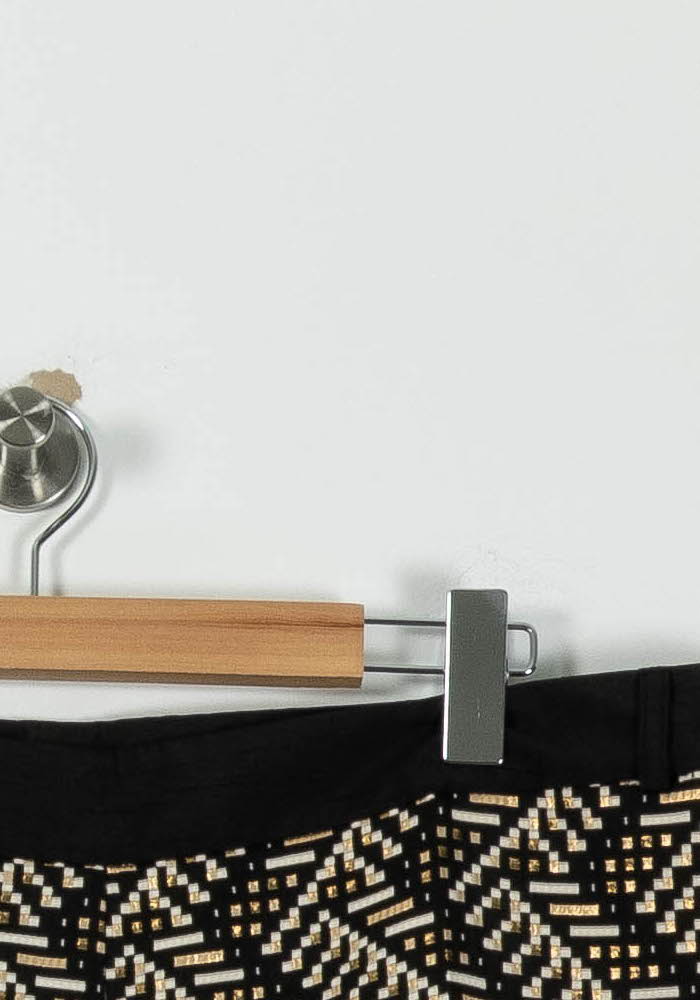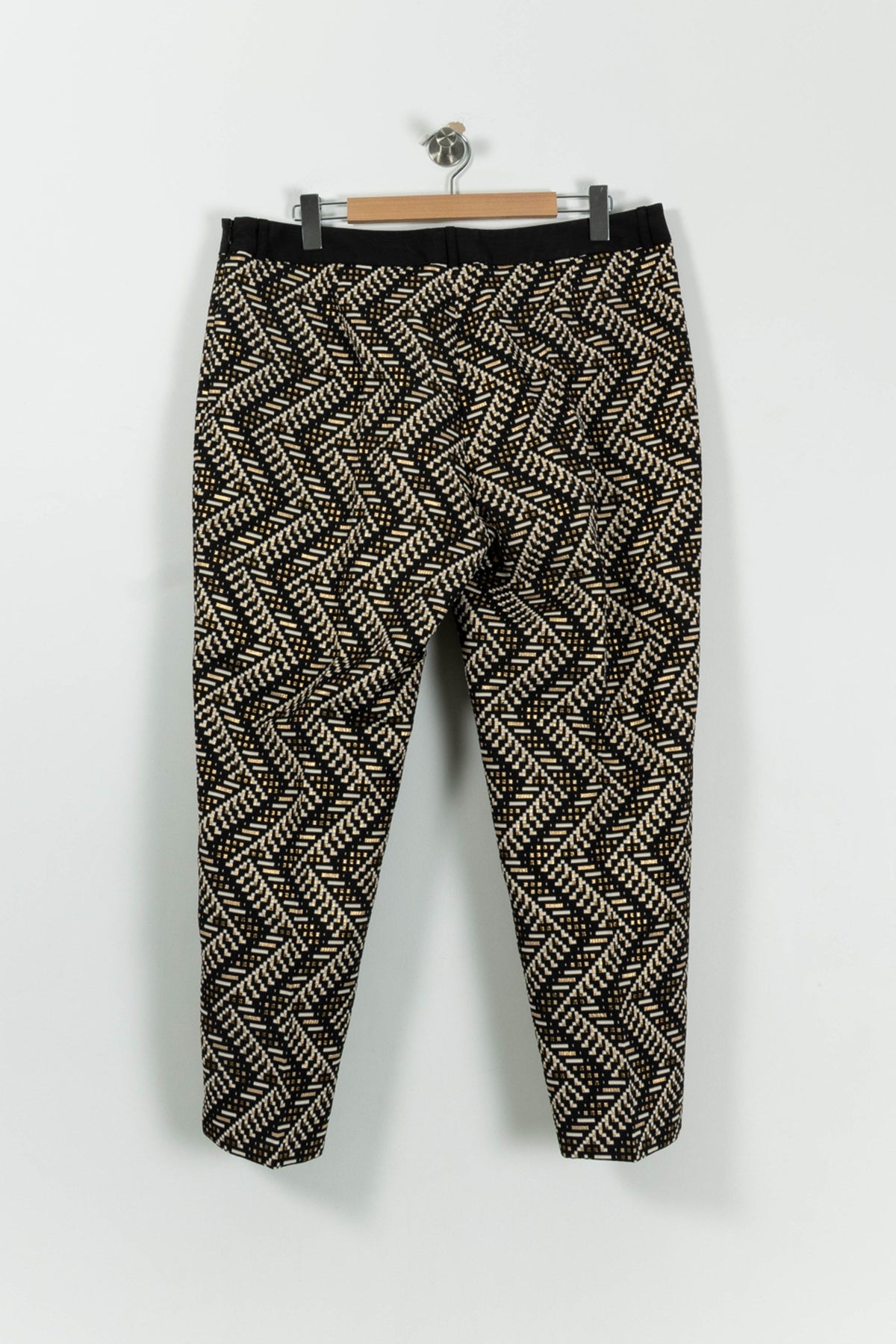 Pantalon imprimé noir Weill, taille XXXL/46, parfait pour apporter une touche originale à votre vestiaire. Confectionné dans un mélange de 85% polyester et 15% coton, ce pantalon se distingue par son motif graphique à chevrons alliant noir, beige et blanc, pour une allure contemporaine et sophistiquée. Idéal pour une journée au bureau associée à une blouse unie ou pour une sortie citadine élégante.