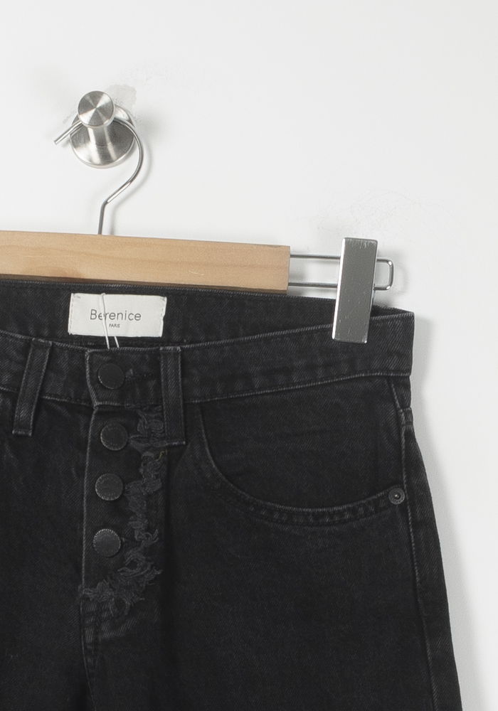 Jean noir Bérénice taille XS/34, coupe droite avec finitions effilées et déchirures décoratives. Confectionné en 100% coton, ce pantalon offre une texture authentique et résistante, soulignée par des détails usés et une bande de boutons apparents qui lui confèrent un style moderne et urbain. Idéal pour une sortie décontractée en ville ou un look casual chic au quotidien.