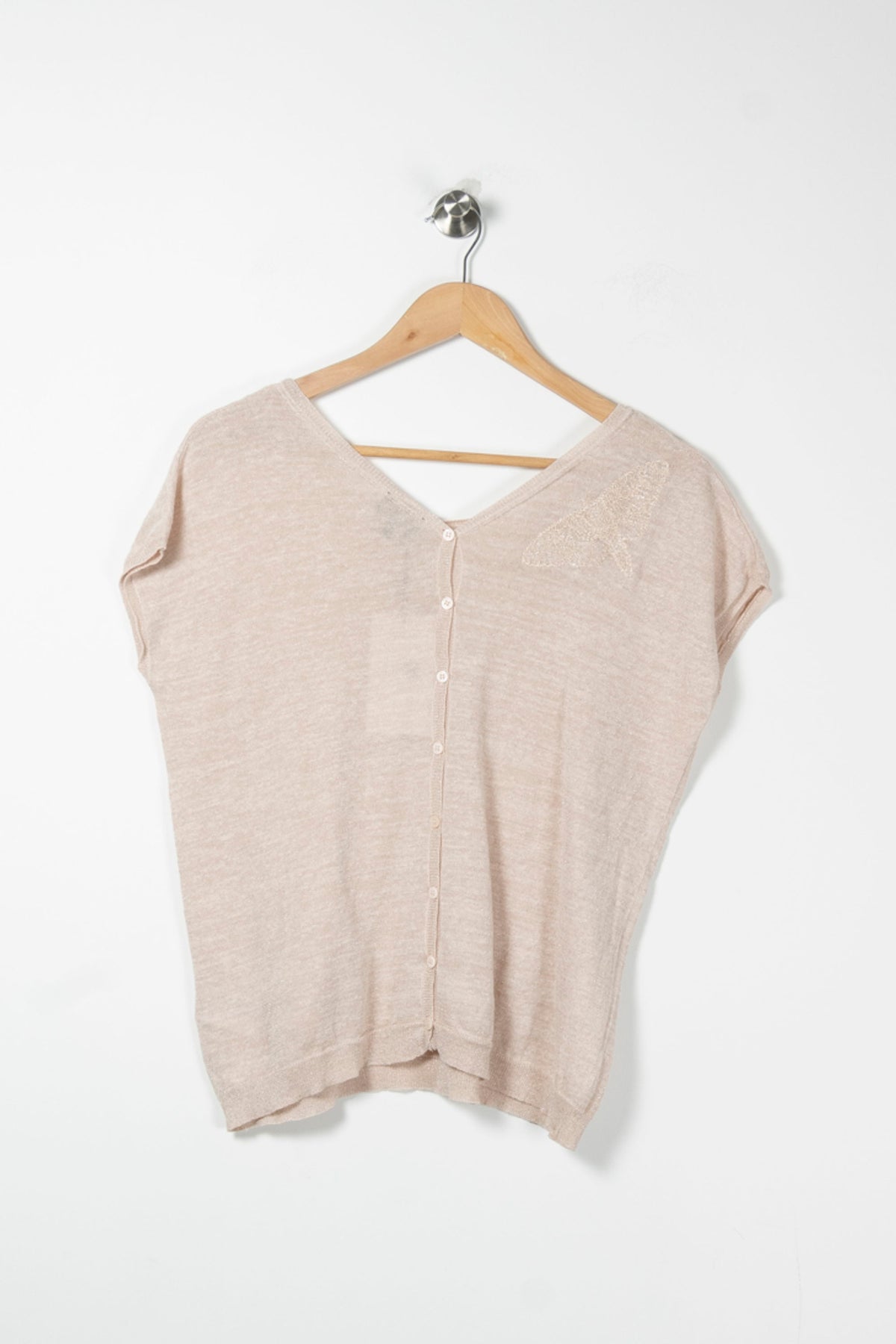 Top rose Bérénice en taille S/36, au style épuré avec col rond et petites manches tombantes. Sa matière composée de 47% lin, 37% coton et 16% polyester offre une douceur naturelle et une belle tenue, tandis que ses deux poches plaquées apportent une touche de modernité raffinée. Idéal pour une journée décontractée au bureau ou une balade élégante en ville.