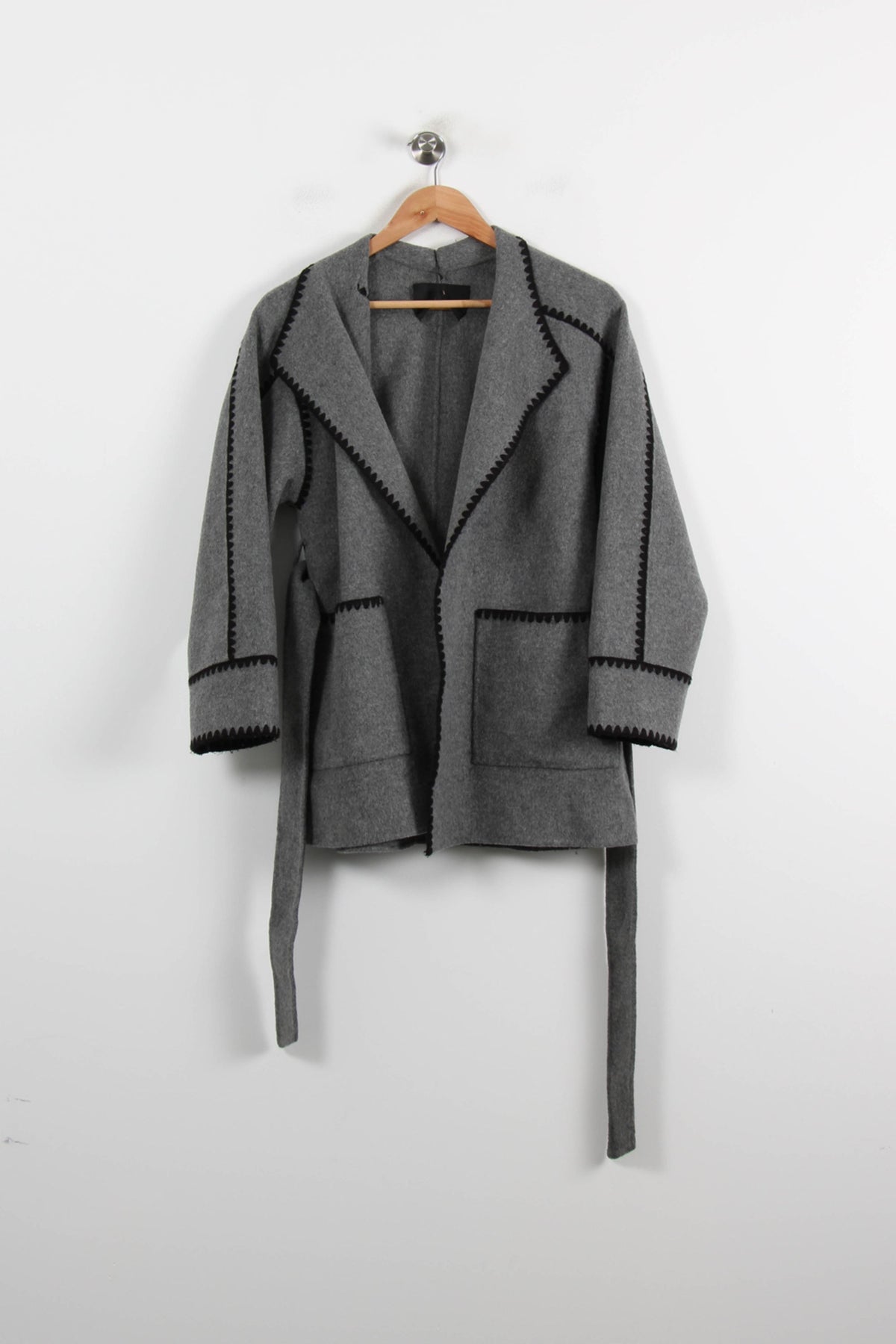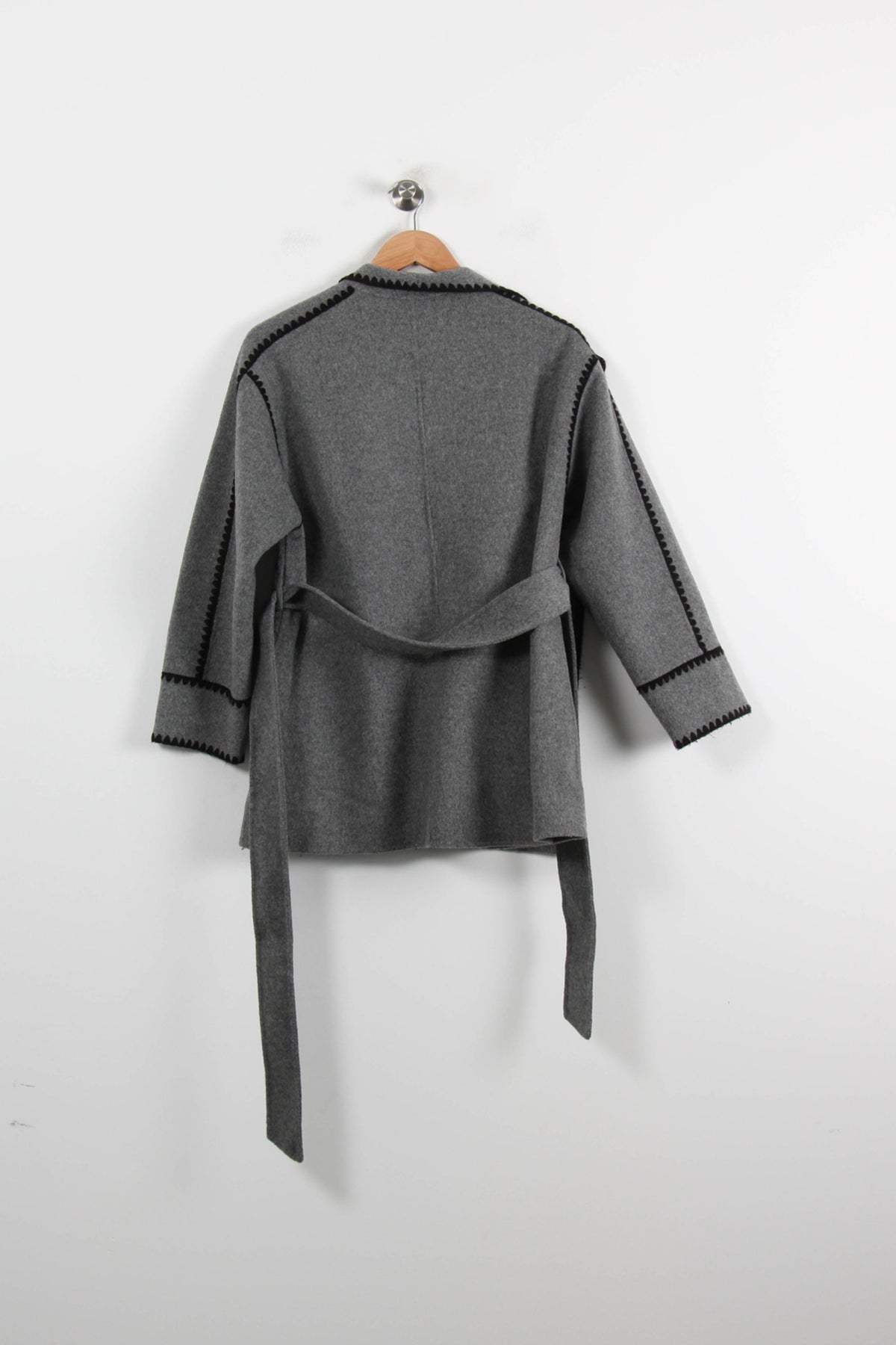 Manteau gris Maje XS/34 – Élégant manteau en laine à la coupe droite, ce modèle de la marque Maje se distingue par sa teinte grise intemporelle et sa taille XS/34. Réalisé dans une matière effet laine feutrée, il est souligné de détails contrastés noirs le long des coutures et possède deux poches plaquées ainsi qu’une ceinture assortie, offrant un style à la fois moderne et sophistiqué. Idéal à porter lors d’une sortie citadine ou d’un rendez-vous professionnel pour une allure raffinée et assurée.