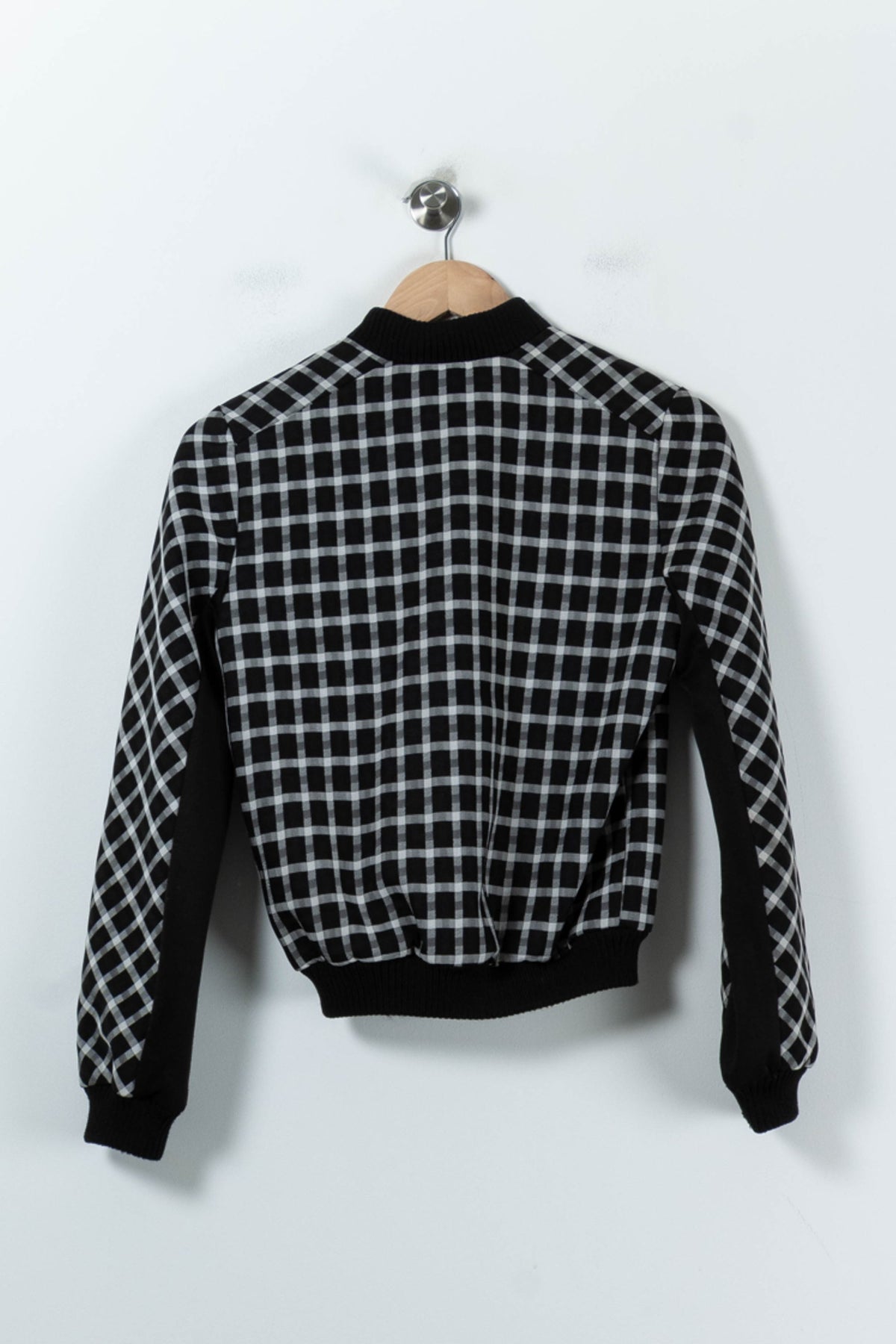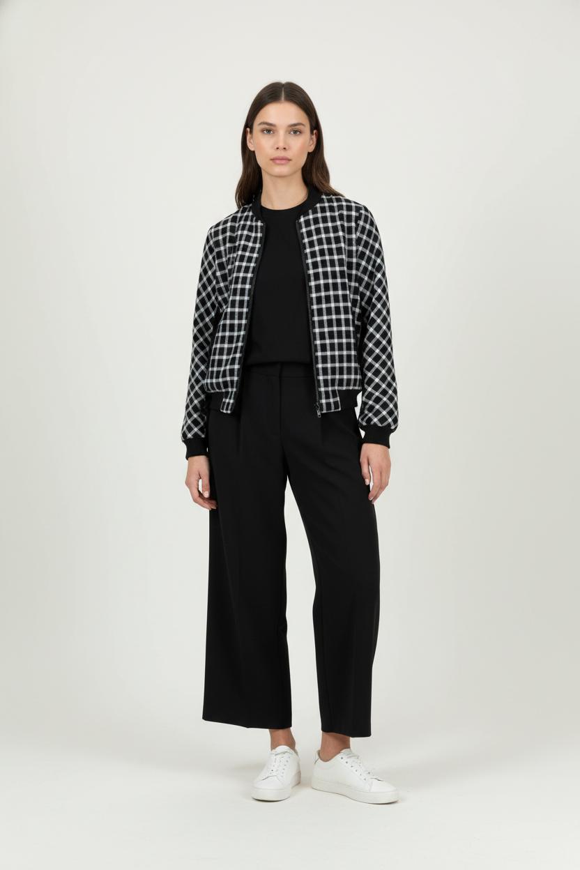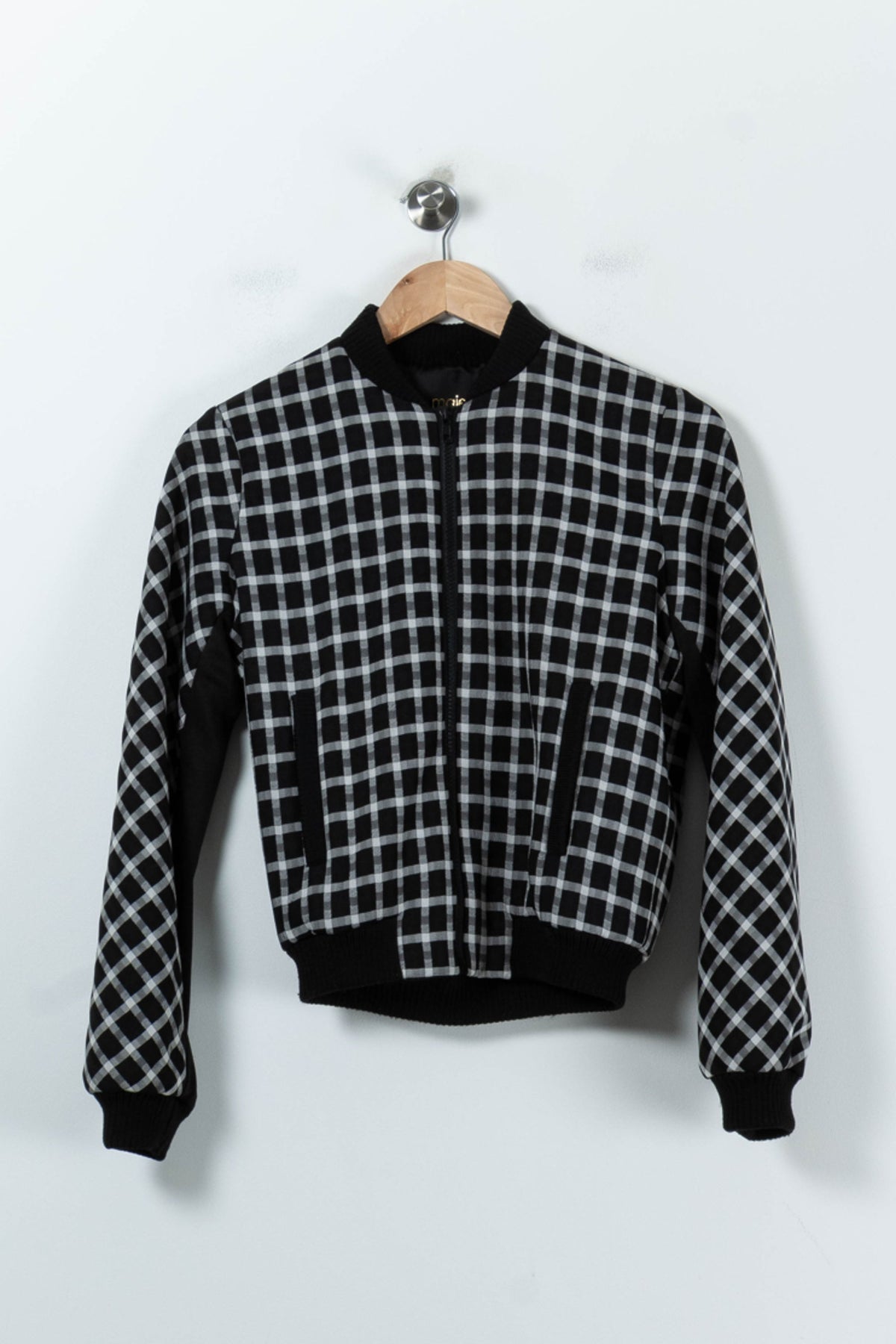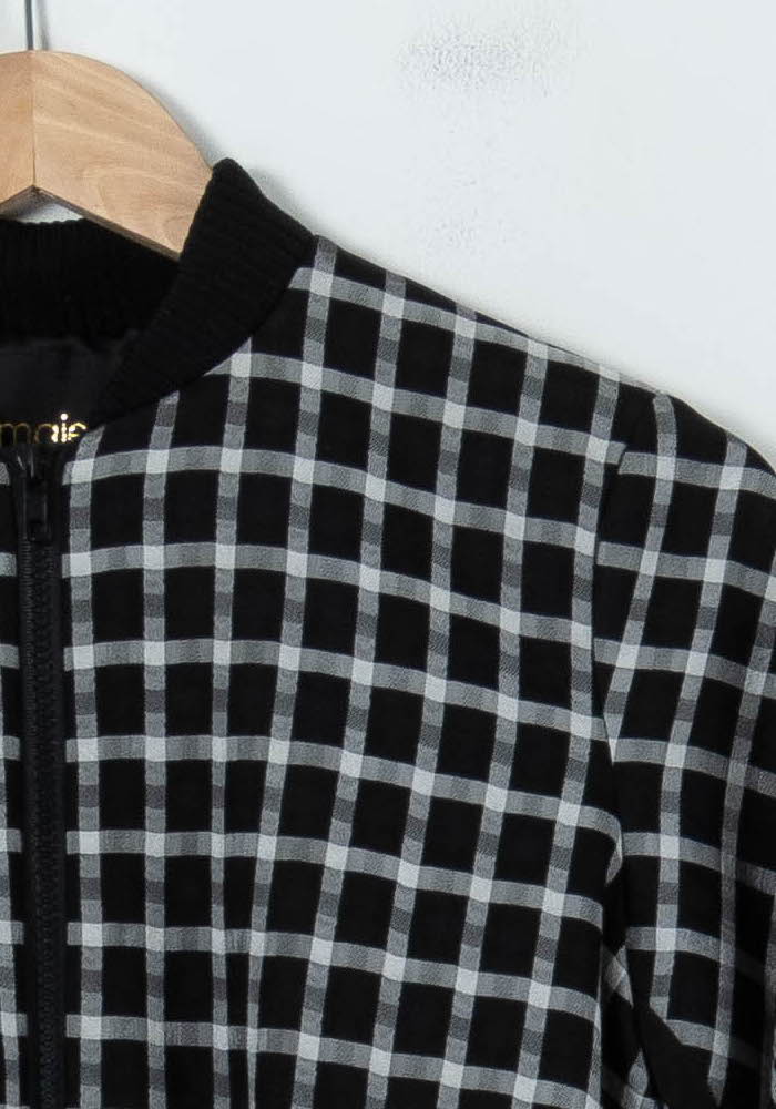 Veste noire à carreaux Maje, taille S/36, au design moderne et graphique, parfaite pour apporter une touche d'élégance à votre vestiaire. Cette veste se distingue par son motif à carreaux noir et blanc ainsi que ses finitions côtelées au col, poignets et à la taille, soulignant un esprit sophistiqué et contemporain. Idéale pour un rendez-vous professionnel ou une sortie citadine, elle s’associe facilement à un jean ou un pantalon chic pour un look soigné.