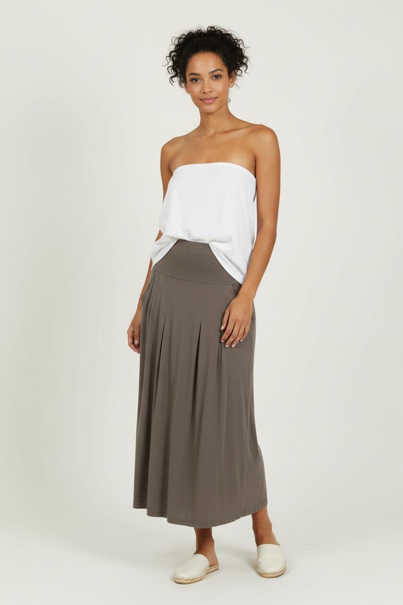 Jupe longue La Fée Maraboutée marron, taille L/40, idéale pour une silhouette décontractée et élégante. Confectionnée en 96% viscose et 4% élasthanne, cette jupe se distingue par sa matière fluide, son tombé souple et ses grandes poches latérales drapées qui lui confèrent une allure unique. Parfaite pour une journée au bureau ou une sortie décontractée, elle allie confort et style avec subtilité.