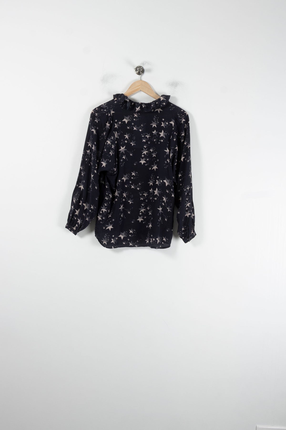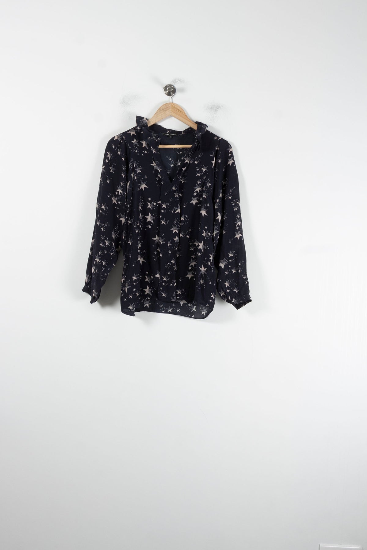 Blouse étoilée bleu marine Tara Jarmon, taille M/38, à manches longues et col volanté, idéale pour une allure raffinée et féminine. Confectionnée en 100% soie, cette pièce se distingue par sa légèreté, la douceur de sa matière et son imprimé étoilé délicat, qui lui confèrent une élégance unique et subtile. Parfaite pour sublimer une tenue de bureau ou pour une sortie élégante en soirée.
