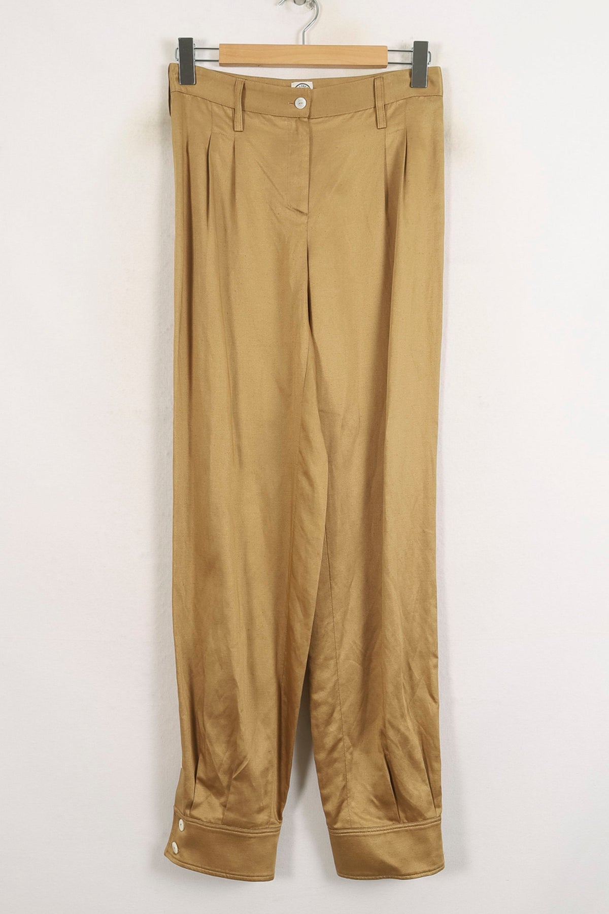 Pantalon beige taille S/36 de la marque Ines de la Fressange Paris, coupe droite avec pinces sur le devant, passants pour ceinture et bas de jambe orné de boutons. La matière semble être une toile structurée offrant un tombé élégant, tandis que les détails des boutons en bas de jambe et les plis à l’avant apportent une touche sophistiquée à ce modèle. Idéal pour une journée de travail au bureau ou un rendez-vous en ville, associé à une chemise ou un pull fin.