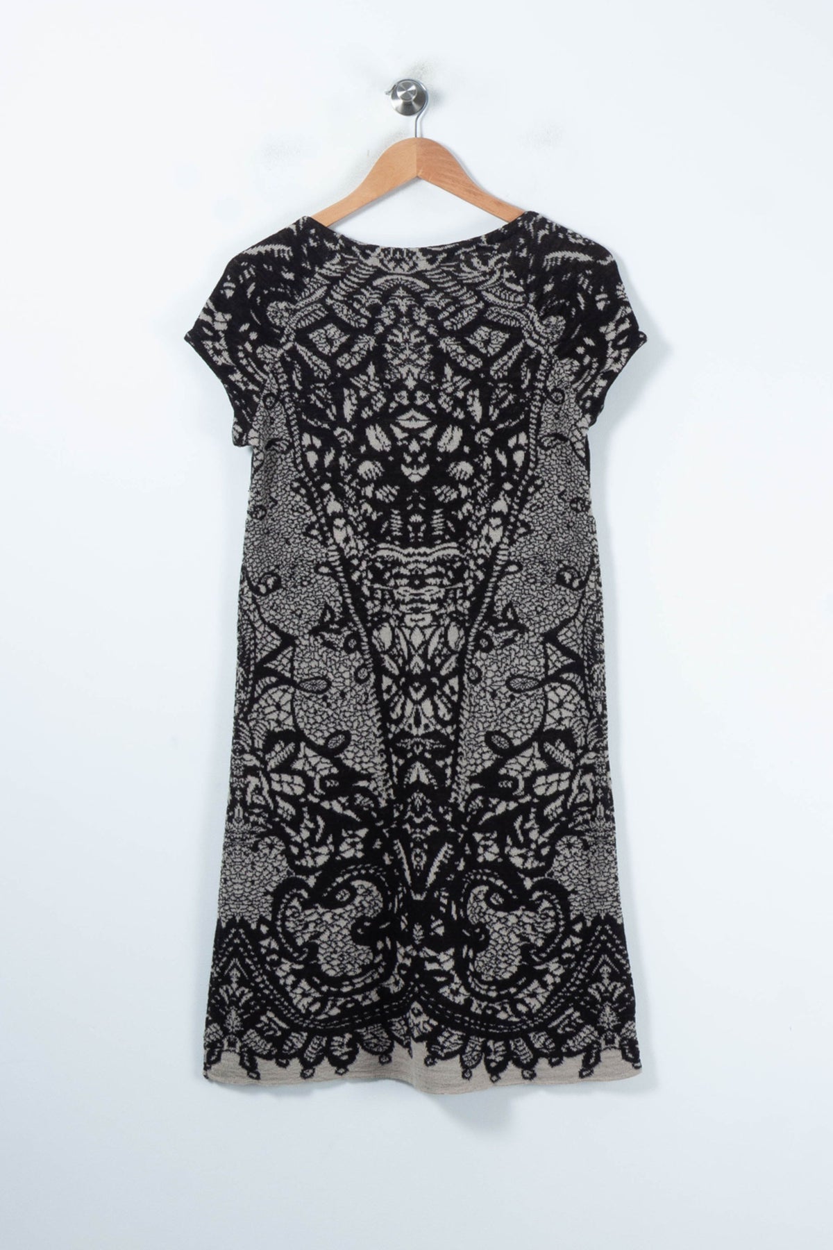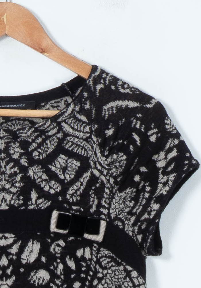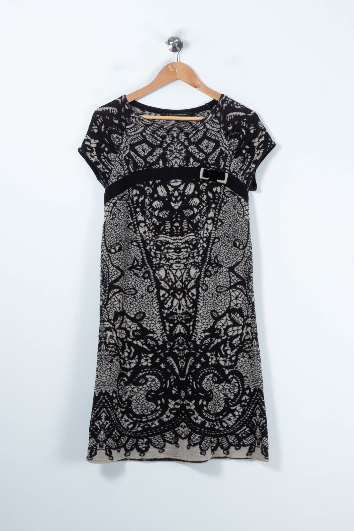 Robe noire La Fée Maraboutée taille M/38, à motifs graphiques élégants et ceinture à boucle discrète à la taille. La composition raffinée associe 58% acrylique, 26% laine, 8% mohair et 8% polyamide, offrant douceur, chaleur et un tombé structuré ; le motif riche ainsi que le détail de la ceinture confèrent à ce modèle une allure unique et sophistiquée. Idéale pour une occasion professionnelle ou une soirée, elle mettra en valeur votre silhouette tout en assurant confort et style.