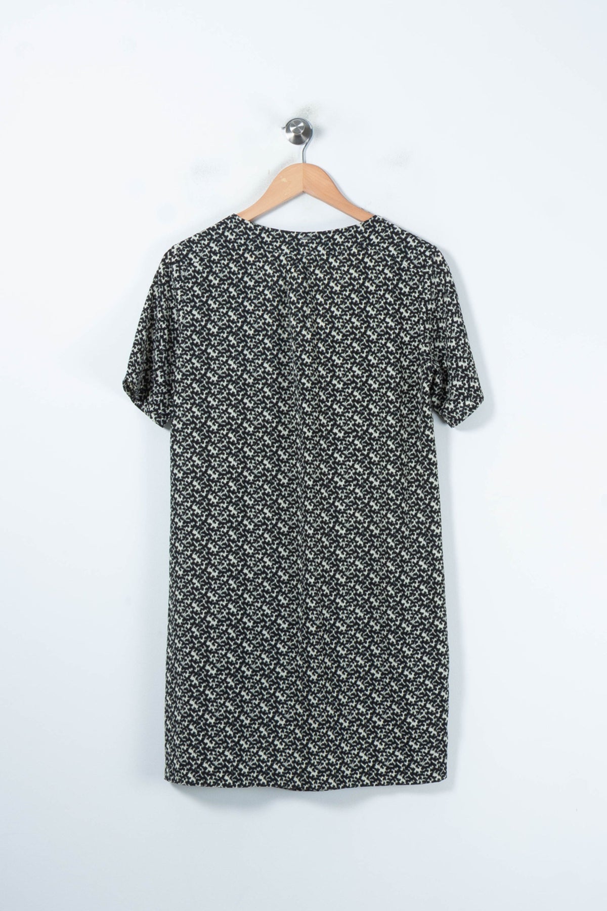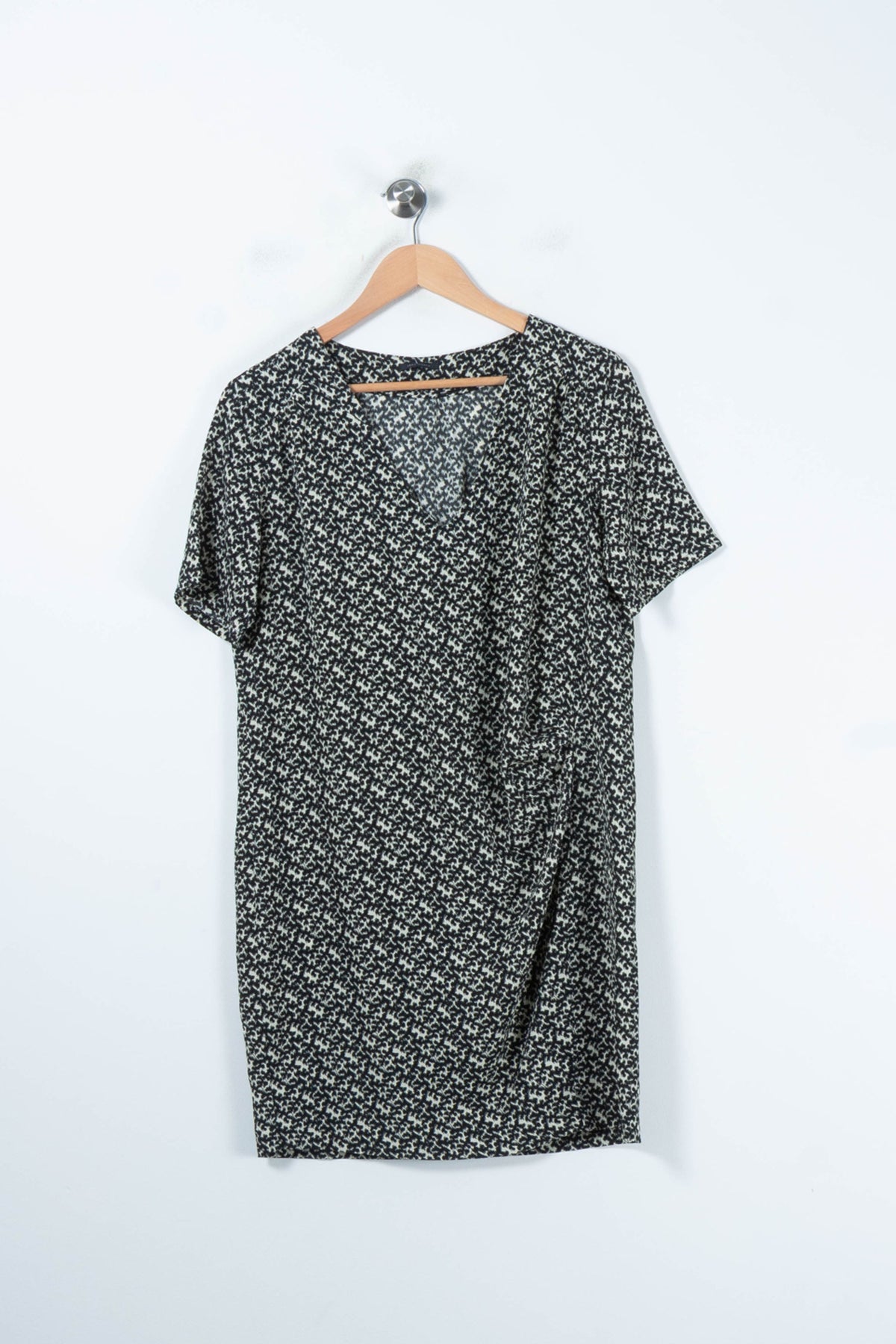 Robe noire imprimée IKKS en taille L/40, à la coupe droite et manches courtes, idéale pour une allure chic et décontractée. Confectionnée en 97% polyester et 3% élasthanne, cette robe présente un motif graphique élégant ainsi qu’un délicat col en V, apportant modernité et raffinement à la silhouette. Parfaite pour une journée au bureau ou un déjeuner en ville, elle s’adapte à toutes vos occasions du quotidien.
