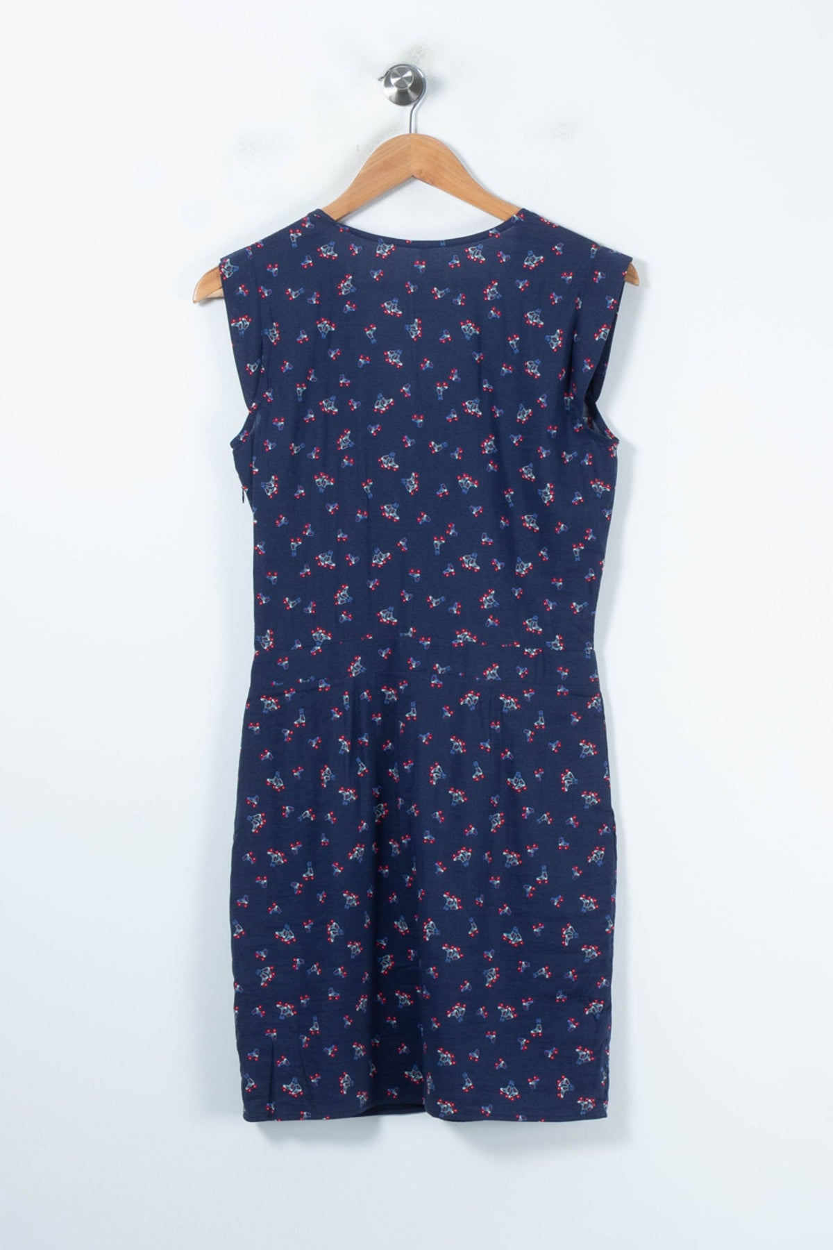 Robe bleu marine fleurie sans manches I.Code, taille XS/34. Confectionnée dans un tissu principal composé de 52% coton et 48% viscose, elle se distingue par son motif fleuri délicat et sa boutonnière sur le devant, apportant à la pièce une touche féminine et raffinée. Parfaite pour une journée estivale, une sortie entre amies ou un pique-nique chic en plein air.