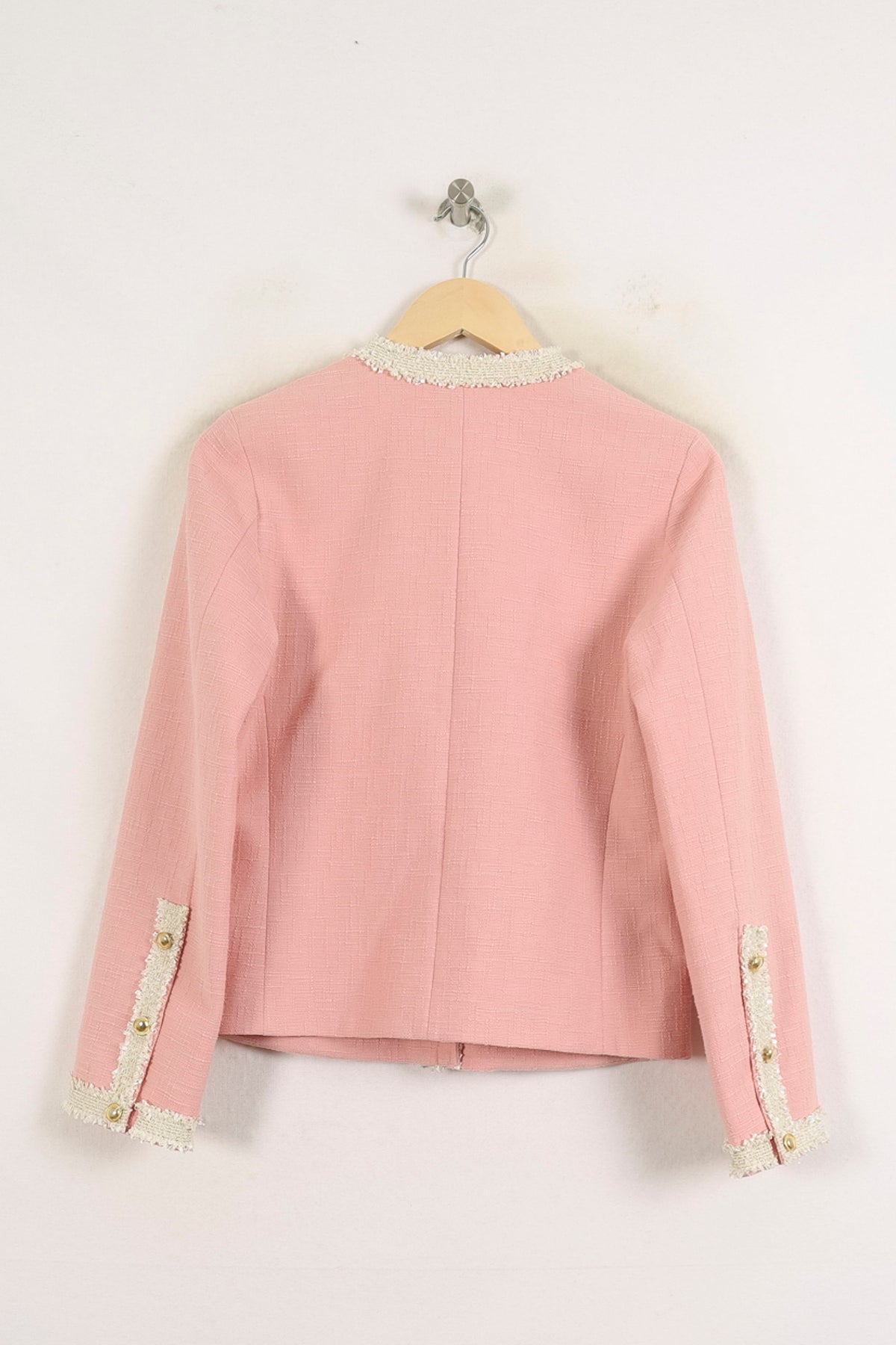 Veste en tweed rose, taille S/36, signée Ines de la Fressange Paris, ornée de boutons dorés et de bordures contrastantes blanches au col, poignets et poches. Sa matière en tweed présente un tissage texturé souligné par des finitions frangées qui apportent une touche sophistiquée et résolument parisienne à cette pièce intemporelle. Idéale pour sublimer une tenue de bureau élégante ou pour un déjeuner chic en ville.