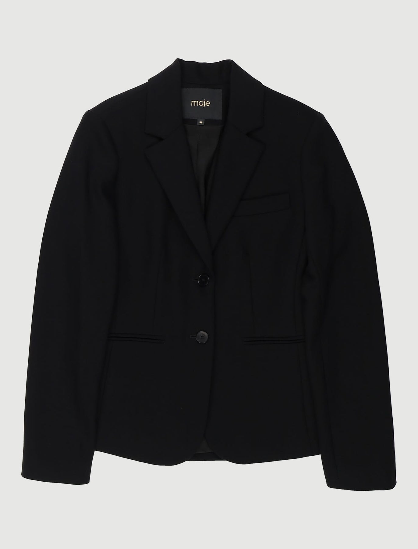 - La veste dispose : d'un col tailleur, d'une coupe ajustée et de trois poches passepoilées dont l'une à la poitrine.