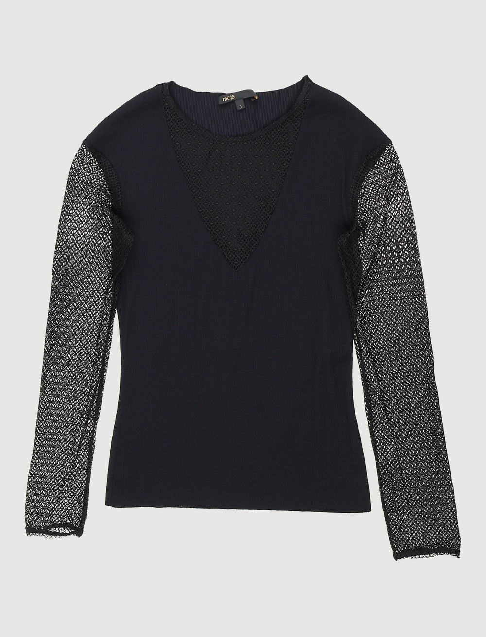- Top en maille légèrement striée avec empiècements ajourés au décolleté et aux manches.