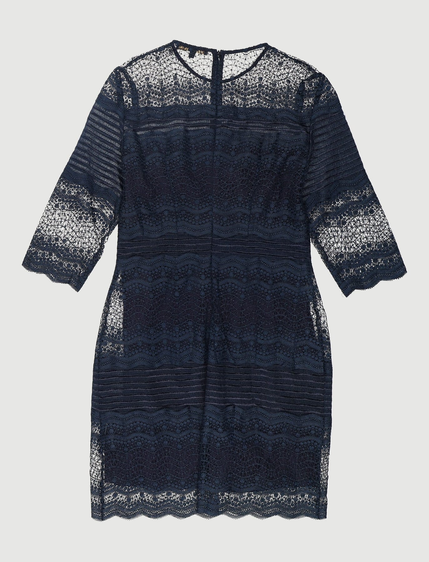 - Confectionnée en dentelle bicolore, la robe est dotée d'une encolure ronde, fendue en son centre et prolongée d'un boutonnage sur la partie haute du buste.
