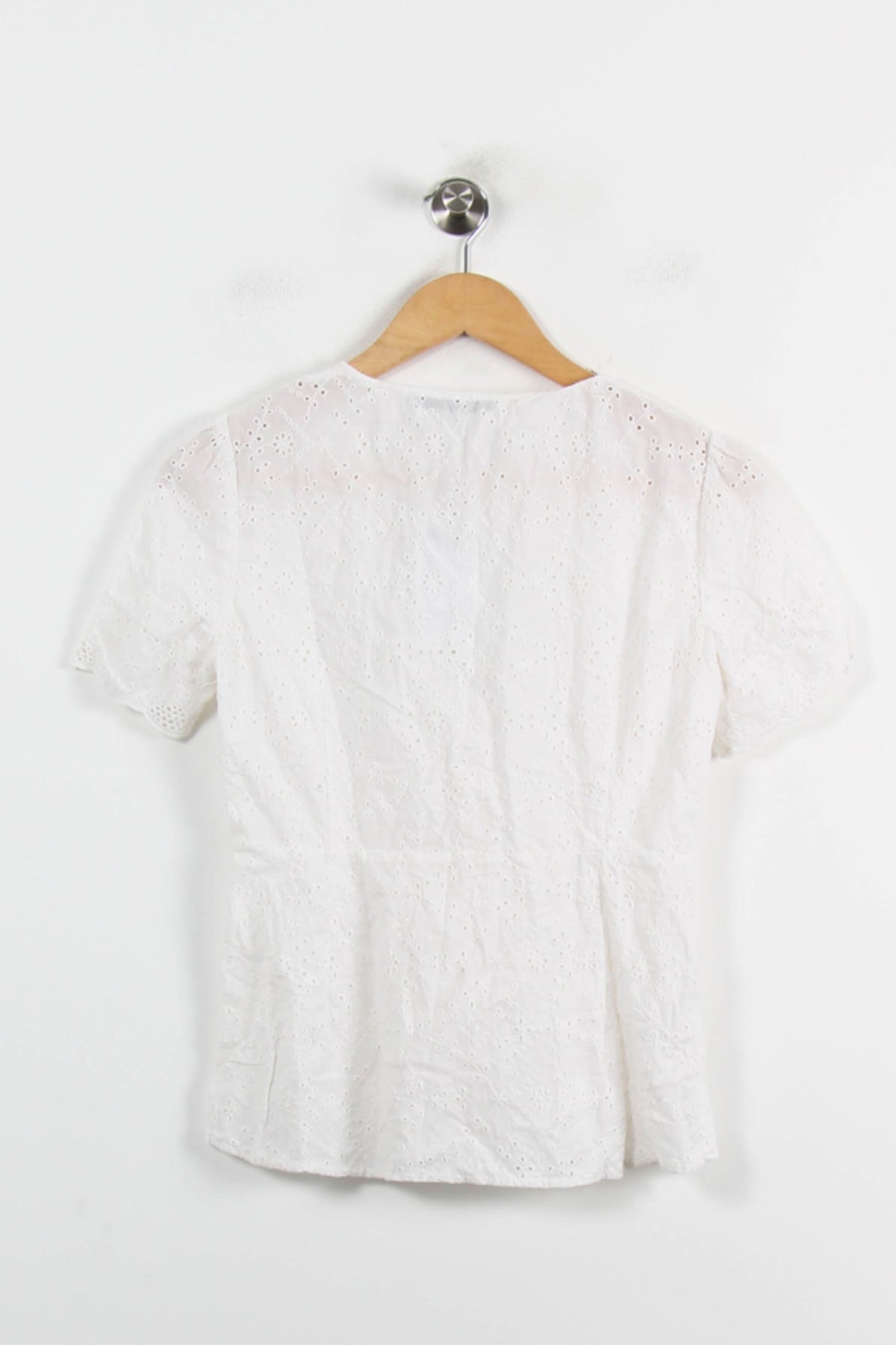 Blouse blanche en broderie anglaise La Fée Maraboutée, taille S/36, élégante et raffinée, idéale pour sublimer toutes vos tenues. Confectionnée dans une matière légère et ajourée, ce top présente des détails de broderie délicats, des manches courtes et une patte de boutonnage, offrant une touche féminine et unique au vêtement. Parfait pour une promenade estivale ou un déjeuner en terrasse, ce haut accompagnera vos moments de détente avec style et fraîcheur.