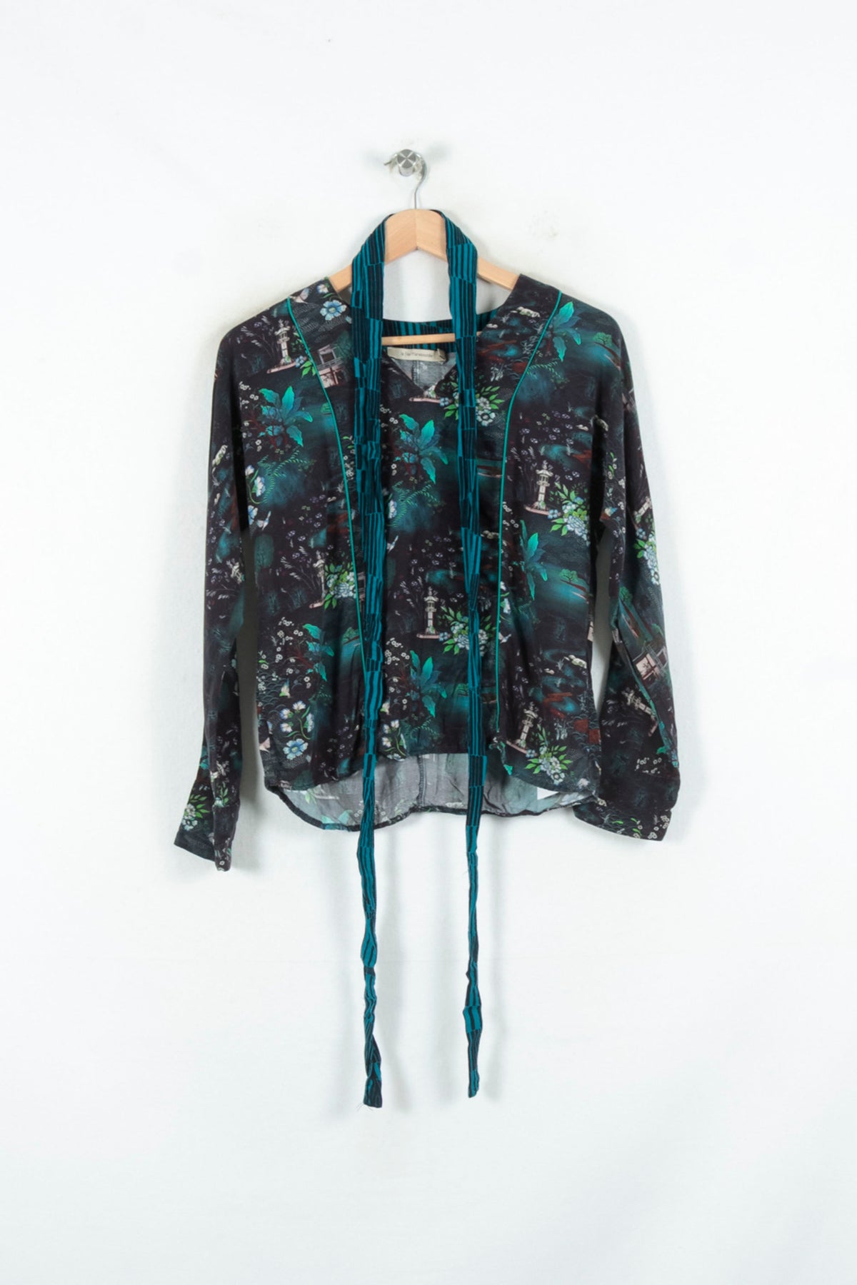 Top fluide bleu à motif floral La Fée Maraboutée, taille XS/34, idéal pour une tenue élégante et raffinée. Ce haut séduit par sa matière légère et transparente, son imprimé végétal aux nuances de bleu et vert, ainsi que ses finitions délicates et son col en V agrémenté de liens longs. Parfait pour une sortie entre amis ou un déjeuner printanier, où style et originalité sont de mise.