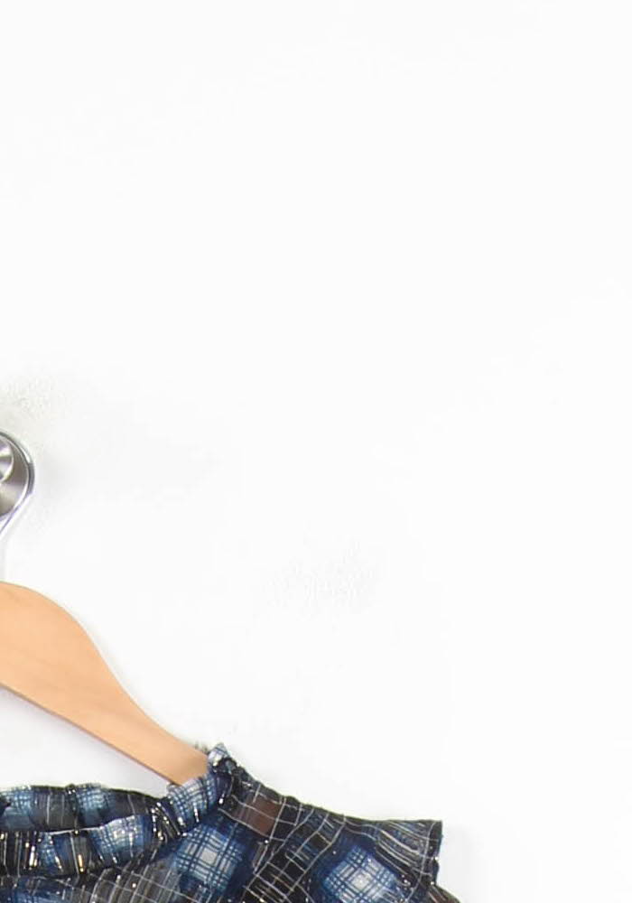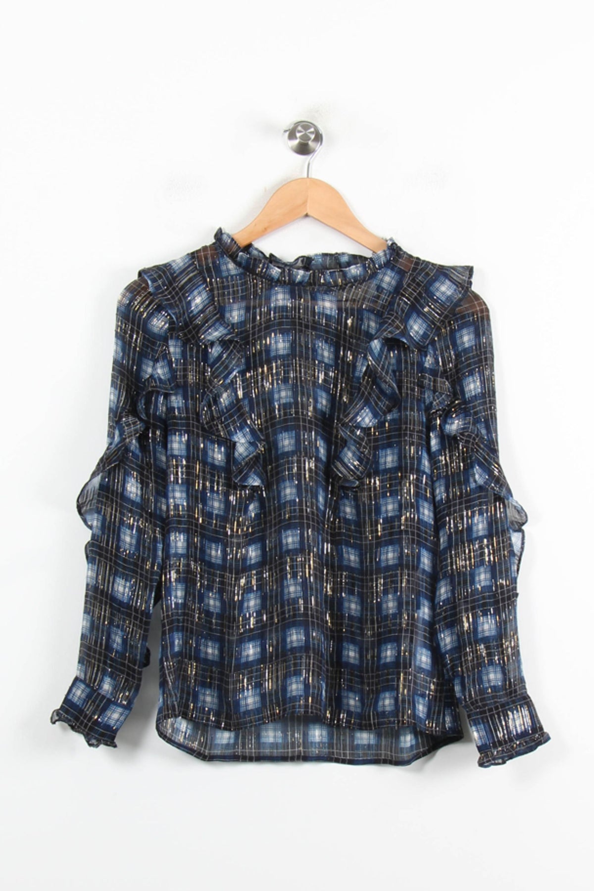 Top à carreaux bleu Bérénice, taille XS/34, élégant mélange de transparence et de fils dorés, orné de volants raffinés pour une touche féminine unique. Sa matière légère et fluide sublime le motif à carreaux agrémenté de détails métallisés, tandis que les volants délicats apportent du volume et du caractère au vêtement. Parfait pour une soirée chic entre amis ou un dîner élégant, accompagné d’un pantalon noir ou d’une jupe sophistiquée.