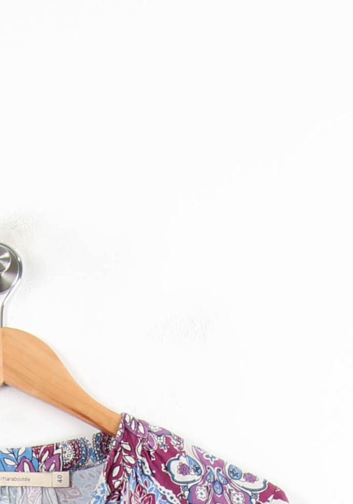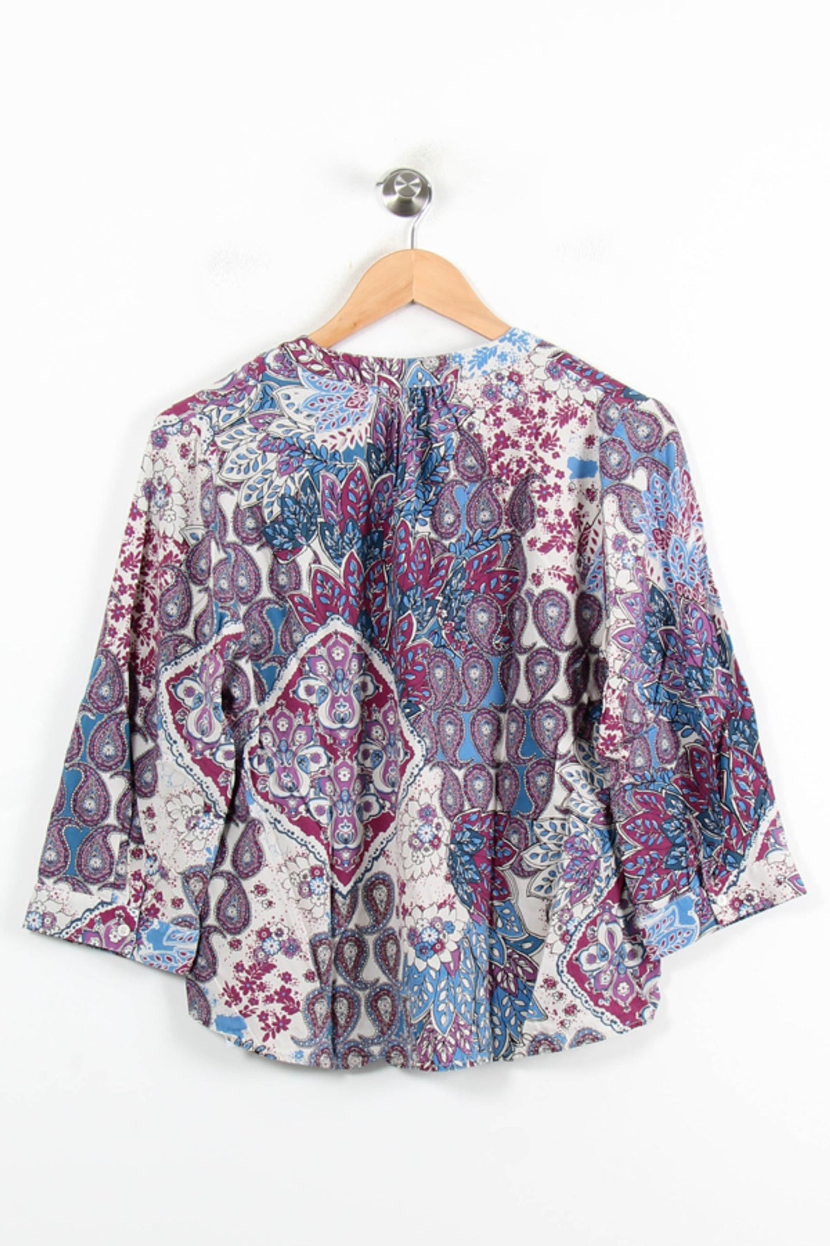Top multicolore La Fée Maraboutée, taille L/40 – ce modèle aux motifs floraux et cachemire dans des tons bleu, prune et blanc apporte une touche de caractère à votre tenue. Confectionné dans une matière fluide, ce top est rehaussé par une encolure en V, des manches trois-quarts et une coupe légèrement ample qui lui confèrent modernité et confort ; l’imprimé apportant une originalité distinctive à la pièce. Idéal pour une journée décontractée ou un dîner entre amis, ce top se porte facilement avec un jean ou une jupe unie pour sublimer son motif.