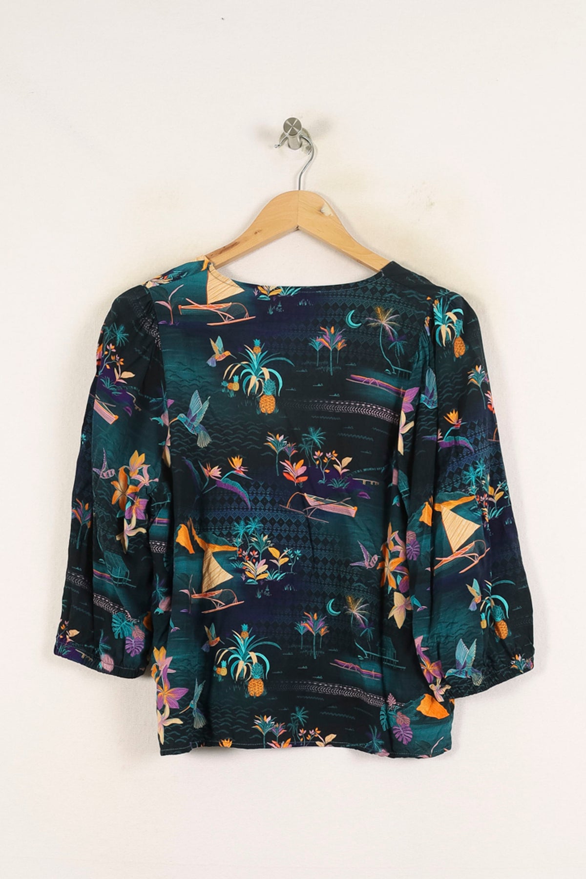 Top multicolore à imprimé tropical – Taille L/40 – La Fée Maraboutée. Ce haut léger présente un tissu fluide orné d’un motif coloré aux inspirations exotiques, rehaussé par un élégant décolleté en V et des manches trois-quarts légèrement bouffantes, détails qui confèrent à ce vêtement une touche unique et sophistiquée. Idéal à porter lors d’une sortie estivale ou d’un déjeuner en terrasse pour une allure élégante et décontractée.
