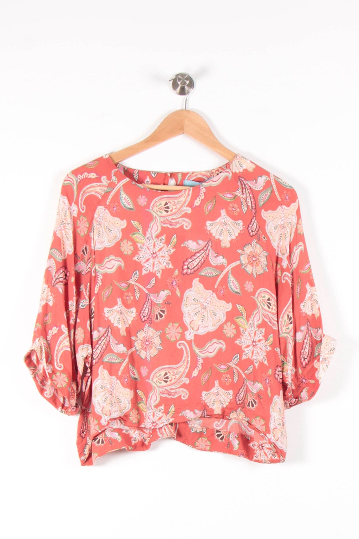 Top multicolore La Fée Maraboutée taille M/38, arborant un imprimé floral et cachemire sur fond corail. Confectionné dans une matière légère à l’aspect soyeux, il se distingue par ses manches trois-quarts bouffantes et son motif délicatement travaillé, qui lui confèrent une allure à la fois originale et raffinée. Idéal pour une journée estivale ou un déjeuner en terrasse, il apporte une touche de fraîcheur et d’élégance à votre tenue.