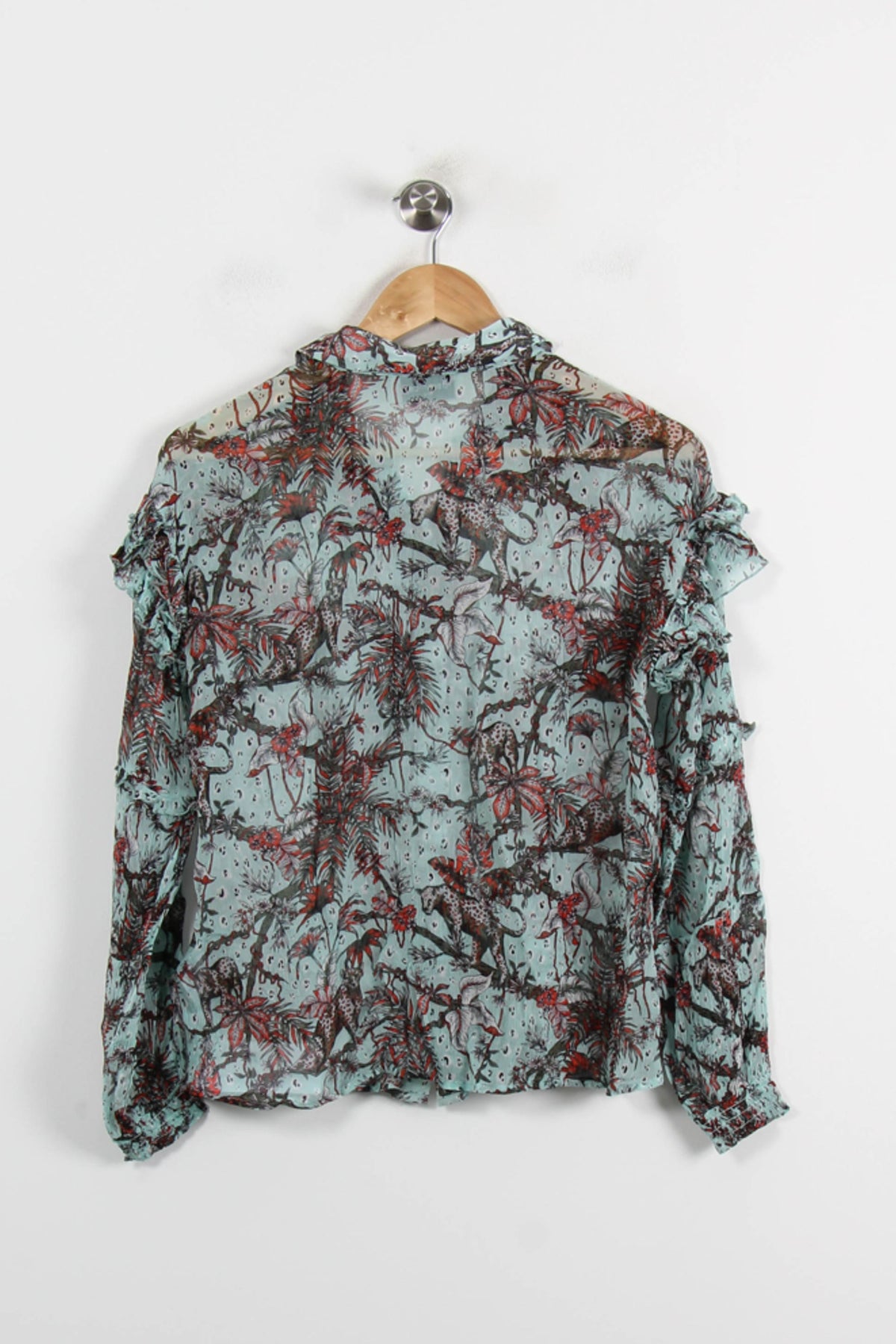 Blouse multicolore Bérénice, taille S/36, au motif jungle et détails volantés, idéale pour apporter une touche élégante et originale à votre garde-robe. Sa matière légère et semi-transparente offre un tombé fluide, tandis que les volants placés sur les manches et le jeu de transparence rendent ce top unique et raffiné. Parfaite pour un déjeuner entre amis ou une réunion professionnelle où l’élégance est de mise.