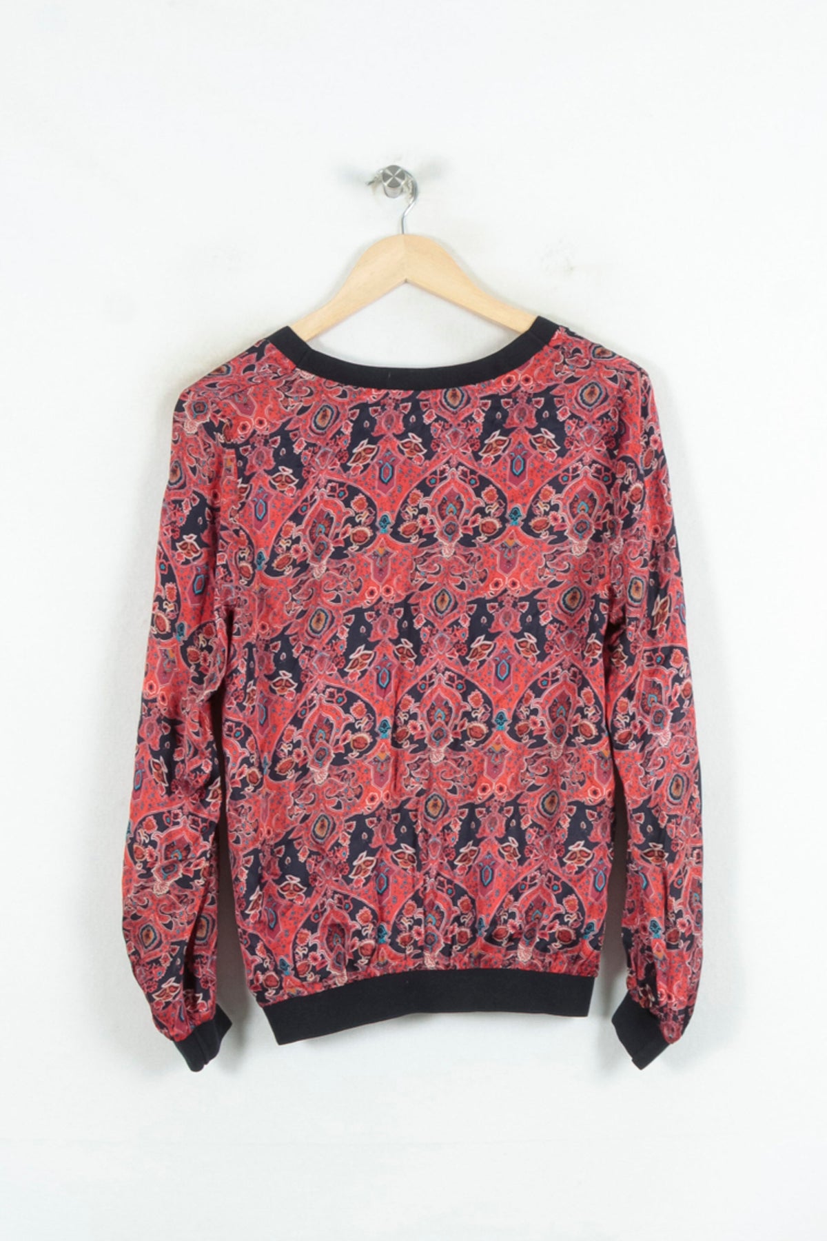 Top multicolore La Fée Maraboutée taille S/36, à imprimé graphique et col en V souligné de liserés noirs. Confectionné dans une matière légère au toucher fluide, ce modèle se distingue par ses bordures contrastées aux poignets et à la taille, ainsi que par la richesse de son motif aux nuances vives offrant une touche d’originalité. Idéal pour une journée au bureau associée à un pantalon sobre ou pour un déjeuner entre amis où l’élégance décontractée est de mise.