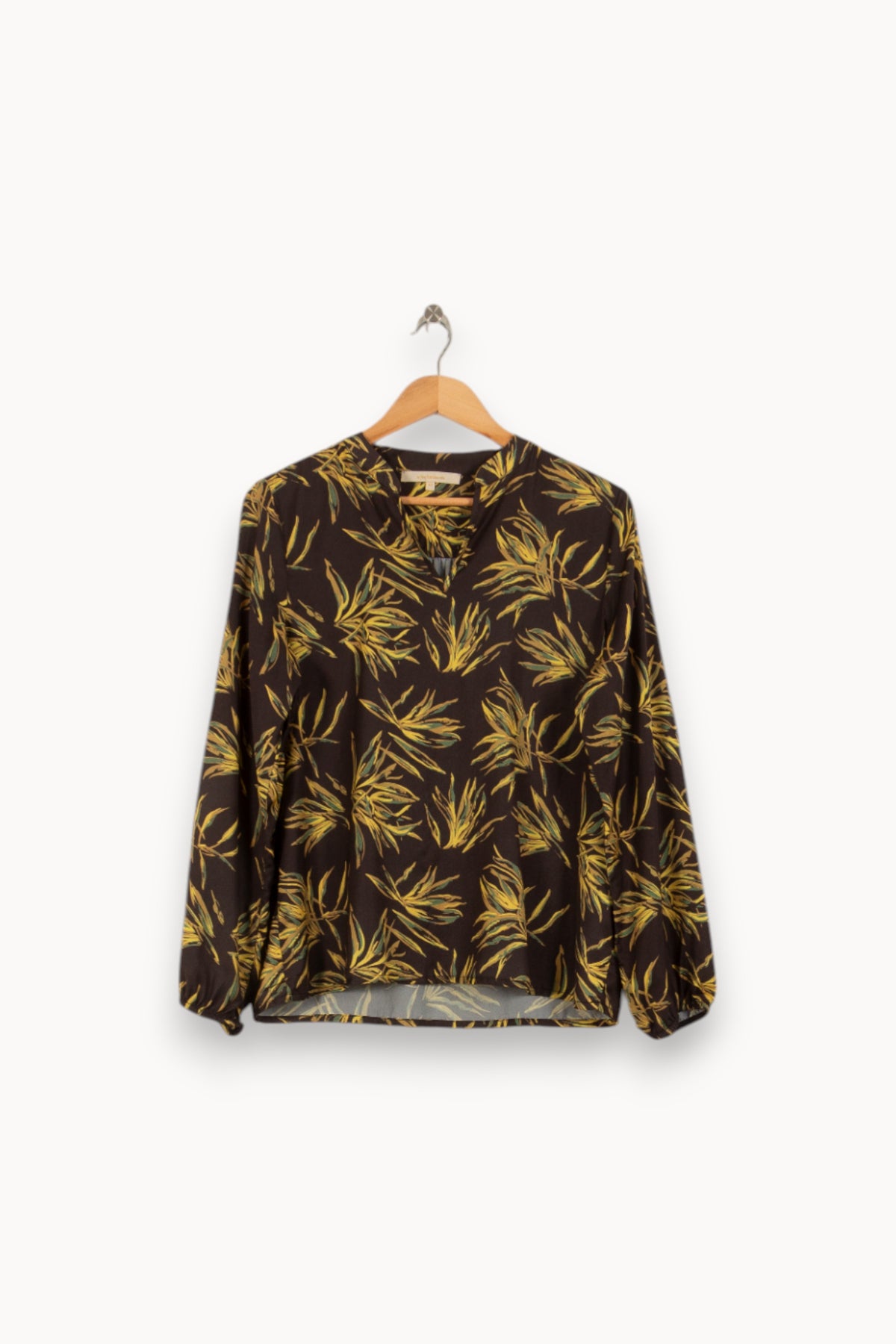 Top multicolore à motif feuillage La Fée Maraboutée, taille XL/42. Confectionné dans un tissu léger à l'imprimé végétal jaune sur fond sombre, ce haut présente une encolure fendue et des manches longues légèrement bouffantes, ce qui lui confère un style raffiné et distinctif. Idéal pour une journée de travail élégante ou un déjeuner en ville.