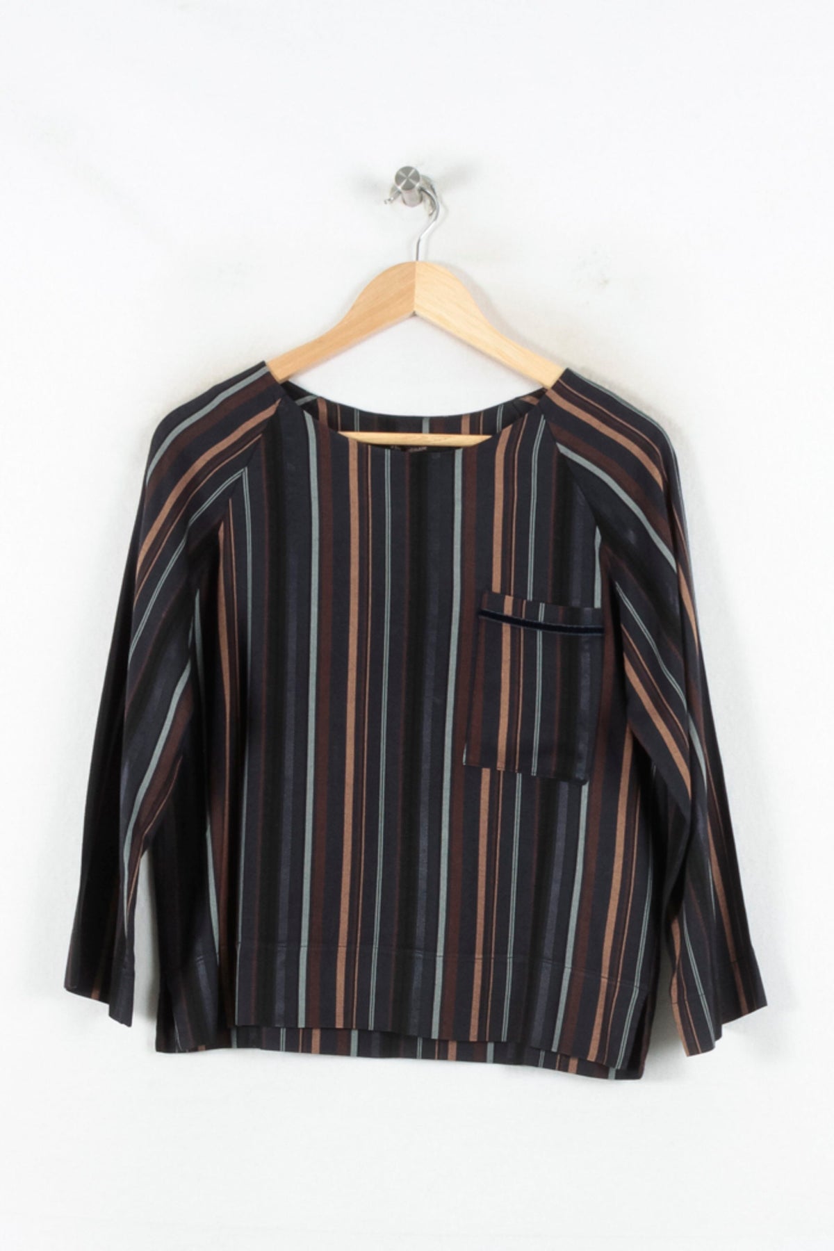 Top à rayures multicolores La Fée Maraboutée, taille M/38, un incontournable pour une allure chic et moderne. Confectionné dans une matière fluide et agréable, ce modèle se distingue par son imprimé rayé aux tons sobres et sa poche poitrine, apportant une touche graphique élégante. À porter idéalement lors d’un déjeuner en ville ou pour une journée au bureau, associé à un pantalon sobre.