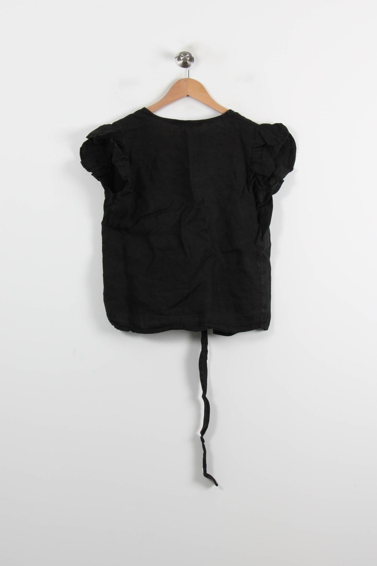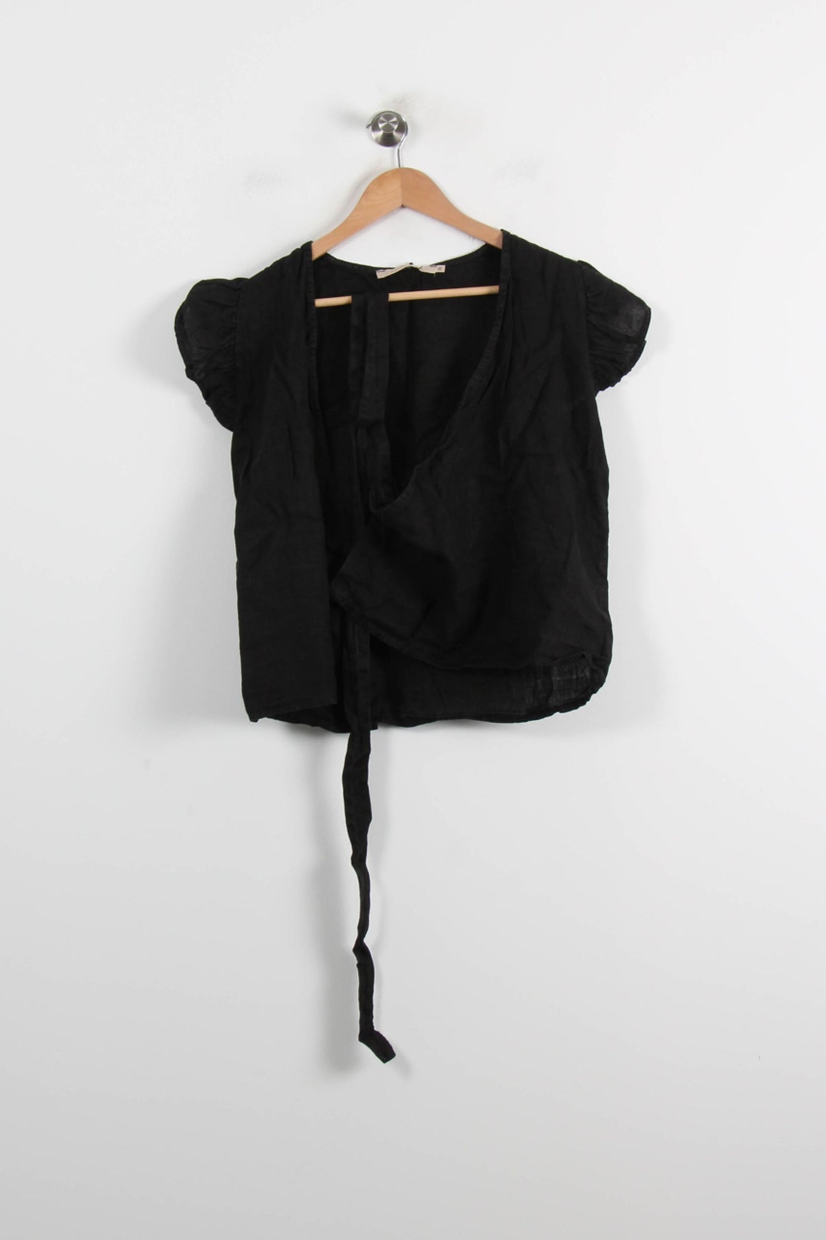 Top noir La Fée Maraboutée, taille S/36, à manches courtes bouffantes et lien à nouer à la taille. Confectionné dans une matière fluide et légère, ce modèle présente une coupe portefeuille élégante, soulignée par des finitions délicates et des manches froncées qui lui apportent originalité et raffinement. Idéal pour une journée estivale au bureau ou une sortie décontractée en ville.