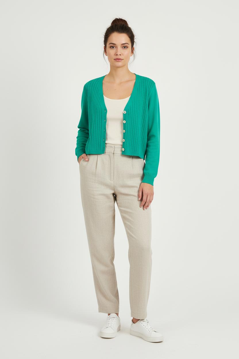 Cardigan vert La Fée Maraboutée taille L/40, élégant et raffiné, parfait pour sublimer toutes vos tenues. Confectionné dans une maille fine ornée de délicates lignes ajourées sur le devant, ce modèle se distingue par ses boutons nacrés et sa coupe légèrement courte qui lui confèrent un style unique et féminin. À porter lors d’un déjeuner printanier ou pour ajouter une touche de couleur à une journée au bureau.