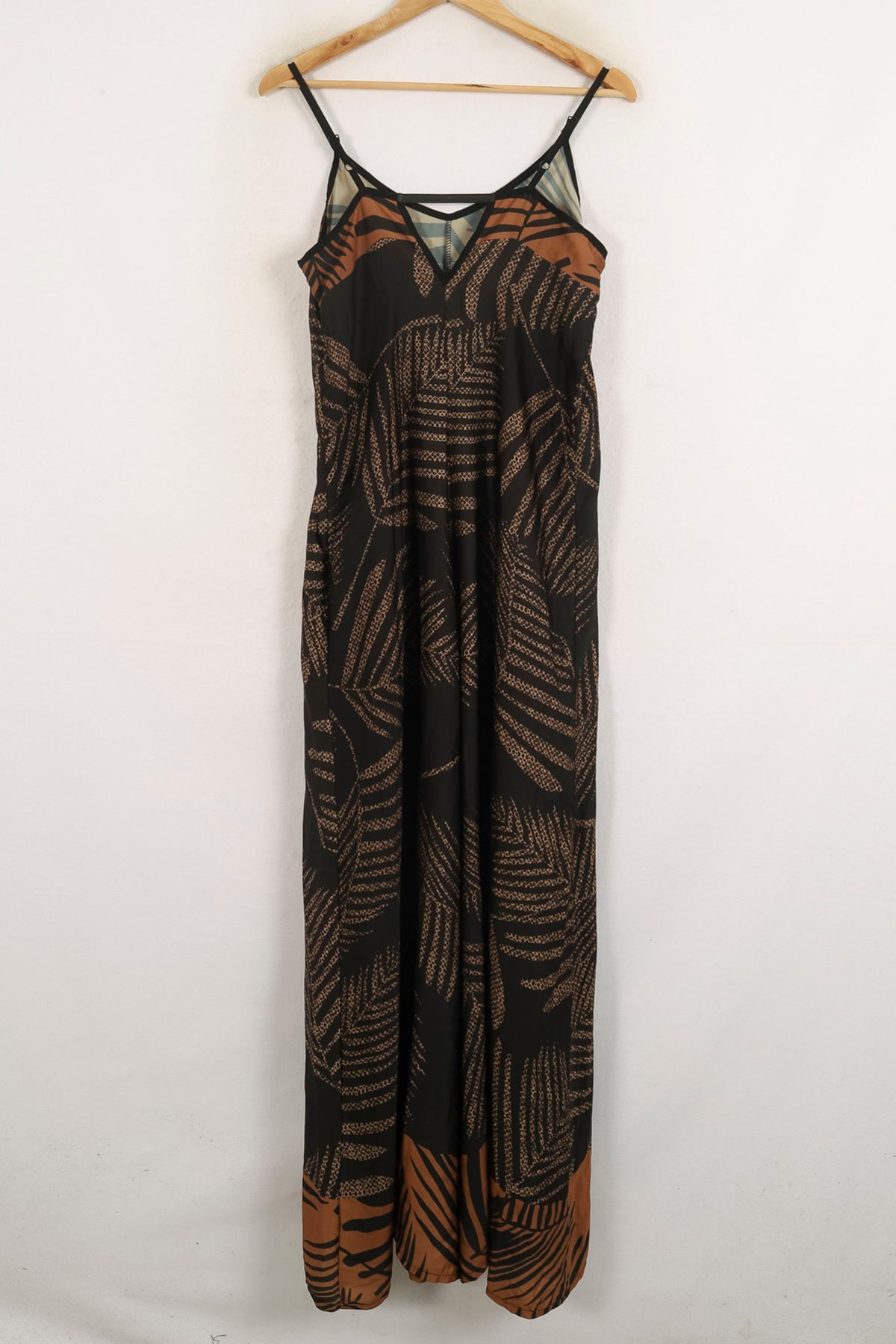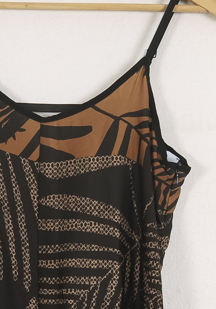 Combinaison multicolore La Fée Maraboutée, taille L/40 – une pièce élégante à fines bretelles, idéale pour une allure sophistiquée et décontractée. Confectionnée dans une matière légère, elle se distingue par son imprimé graphique à motifs de feuilles dans des tons marron et noir, apportant originalité et raffinement. À porter lors d’une soirée estivale ou d’un événement en plein air pour un style chic et naturel.