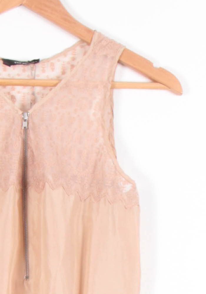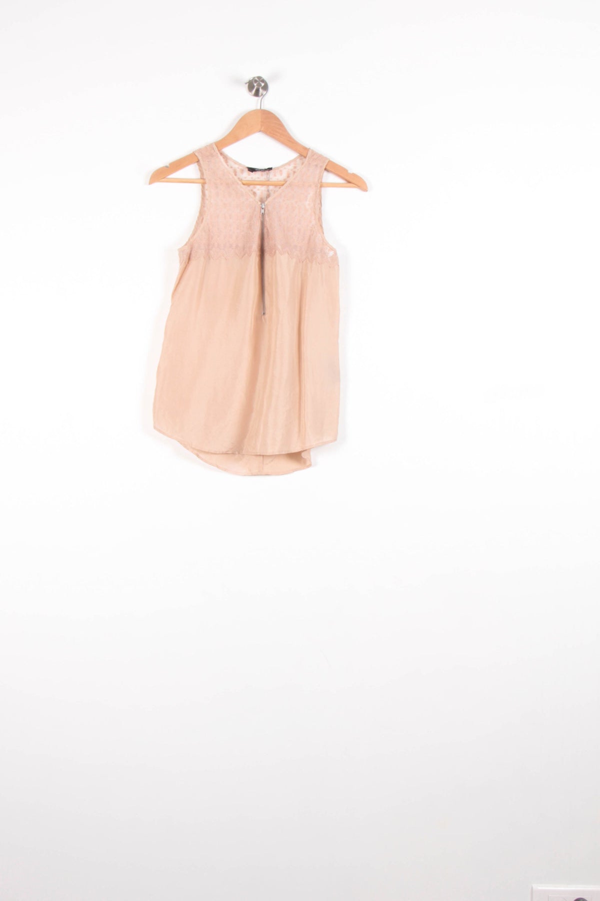 Top sans manches beige The Kooples, taille XS/34, offrant une silhouette féminine et élégante. La partie supérieure du vêtement est délicatement travaillée en dentelle, agrémentée d'une fermeture zippée centrale, qui confère à ce top une touche moderne et raffinée. Idéal pour une soirée estivale ou un événement chic où l’on souhaite allier confort et sophistication.