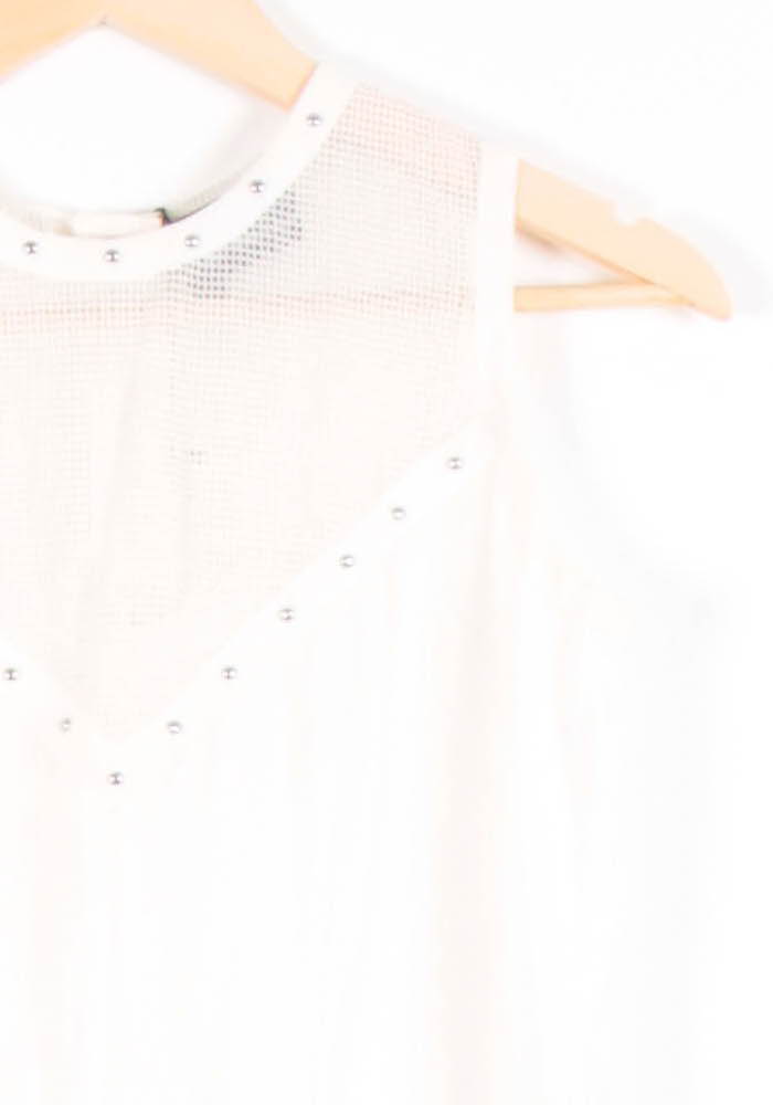 Top sans manches The Kooples, taille XS/34, coloris blanc, confectionné dans une matière légère et transparente. Sa maille délicate, rehaussée de petits clous métalliques au niveau du col, apporte une touche moderne et raffinée qui singularise ce modèle. Idéal pour sublimer une tenue de journée estivale ou pour un dîner chic en toute sobriété.