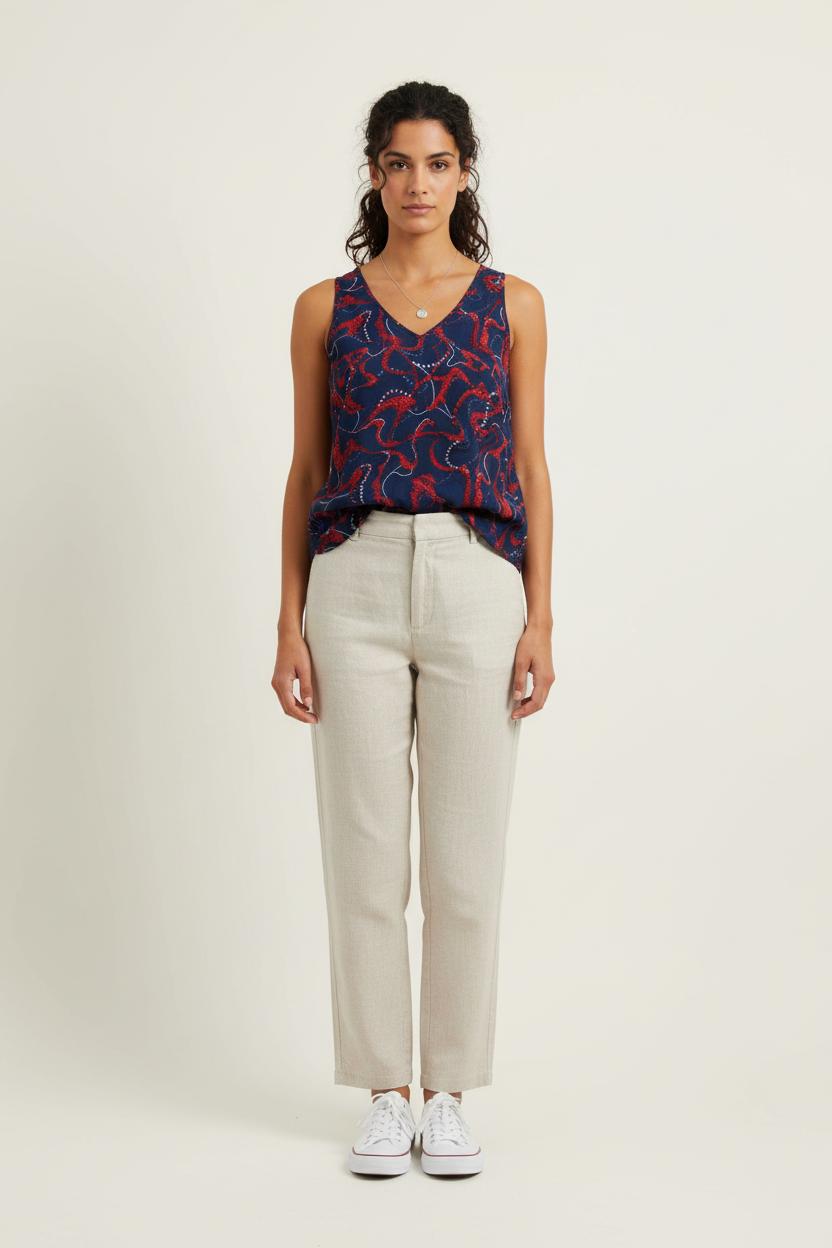 Top sans manches multicolore Bérénice, taille S/36, au motif abstrait rouge et bleu sur fond foncé pour un style moderne et élégant. Confectionné dans une matière fluide offrant un tombé naturel et agréable, ce haut se distingue par son imprimé graphique dynamique et l’originalité de son ourlet arrondi légèrement plus long au dos. Parfait pour une journée estivale, il s'accordera facilement avec un pantalon clair ou une jupe pour un look casual chic.