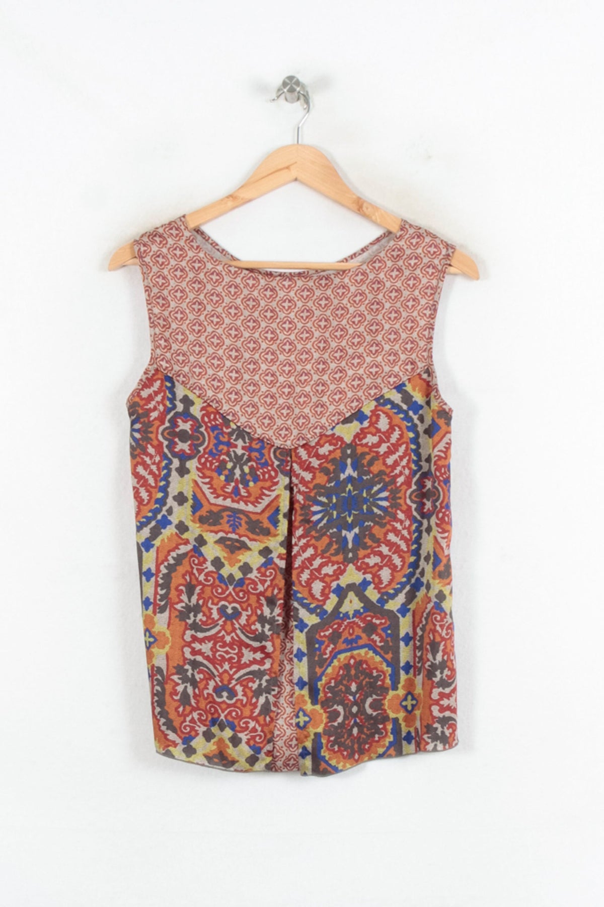 Top imprimé multicolore La Fée Maraboutée, taille S/36, offrant une coupe sans manches et une encolure ronde pour un style bohème chic. Ce haut se distingue par son tissu léger aux motifs géométriques colorés et détaillés, associant harmonieusement des teintes chaudes et des touches de bleu profond pour une allure singulière. Idéal pour une sortie estivale, il s'associe aisément à un pantalon clair ou une jupe fluide.