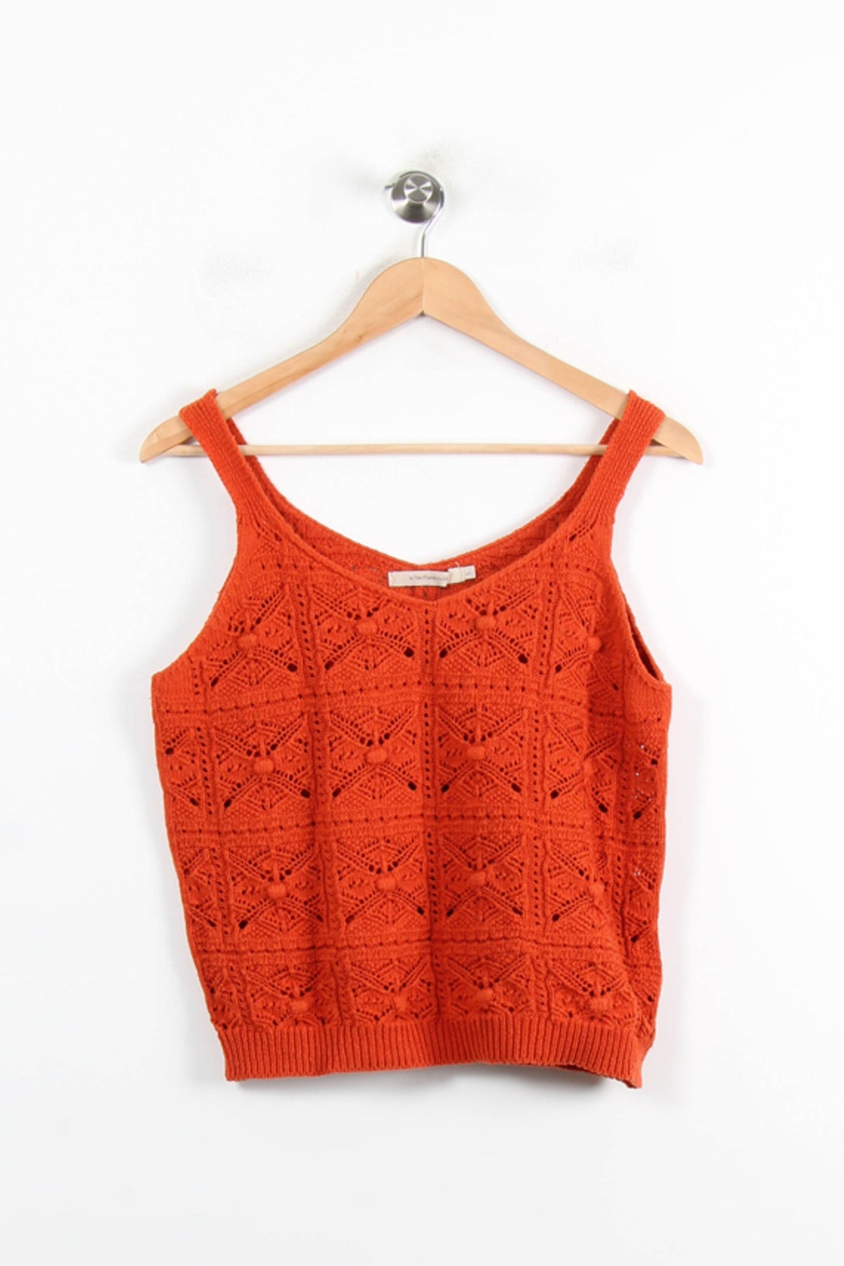 Top orange en maille ajourée La Fée Maraboutée, taille L/40, parfait pour apporter une touche de couleur et d'élégance à votre garde-robe estivale. Ce modèle se distingue par sa matière crochetée, mettant en valeur un motif géométrique raffiné et original, qui apporte relief et singularité à l’ensemble. À porter lors d’un déjeuner en terrasse ou pour une journée en bord de mer, il sublimera vos tenues décontractées avec style.
