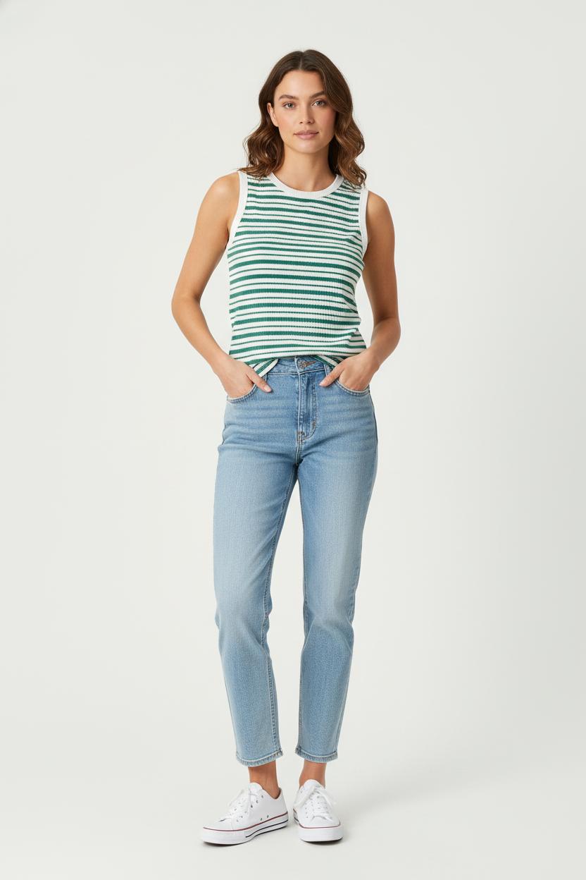 Top sans manches rayé vert et blanc La Fée Maraboutée, taille S/36, parfait pour une touche de fraîcheur dans votre vestiaire. Confectionné dans une maille côtelée, ce haut se distingue par ses rayures horizontales régulières et ses finitions contrastées aux bords, offrant une allure contemporaine et raffinée. Idéal pour une journée estivale au parc ou une promenade en bord de mer accompagné d’un pantalon clair.