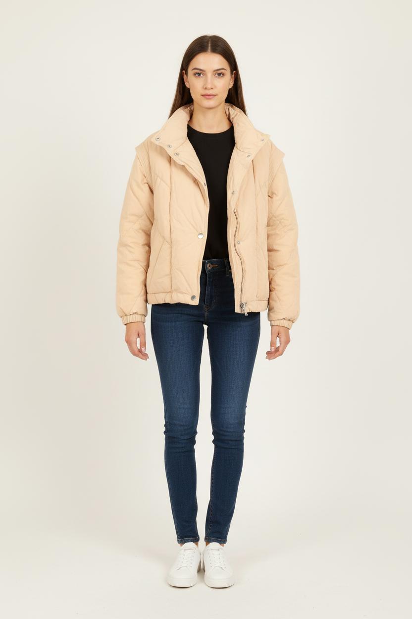Manteau matelassé beige Bérénice taille M/38, au design moderne et épuré, idéal pour affronter les saisons fraîches avec élégance. Sa matière matelassée assure confort et chaleur, tandis que la fermeture boutonnée asymétrique accompagnée d’un col montant et de poches diagonales apporte une touche contemporaine et singulière à la pièce. Parfait pour une promenade citadine ou un rendez-vous décontracté lors des journées automnales.