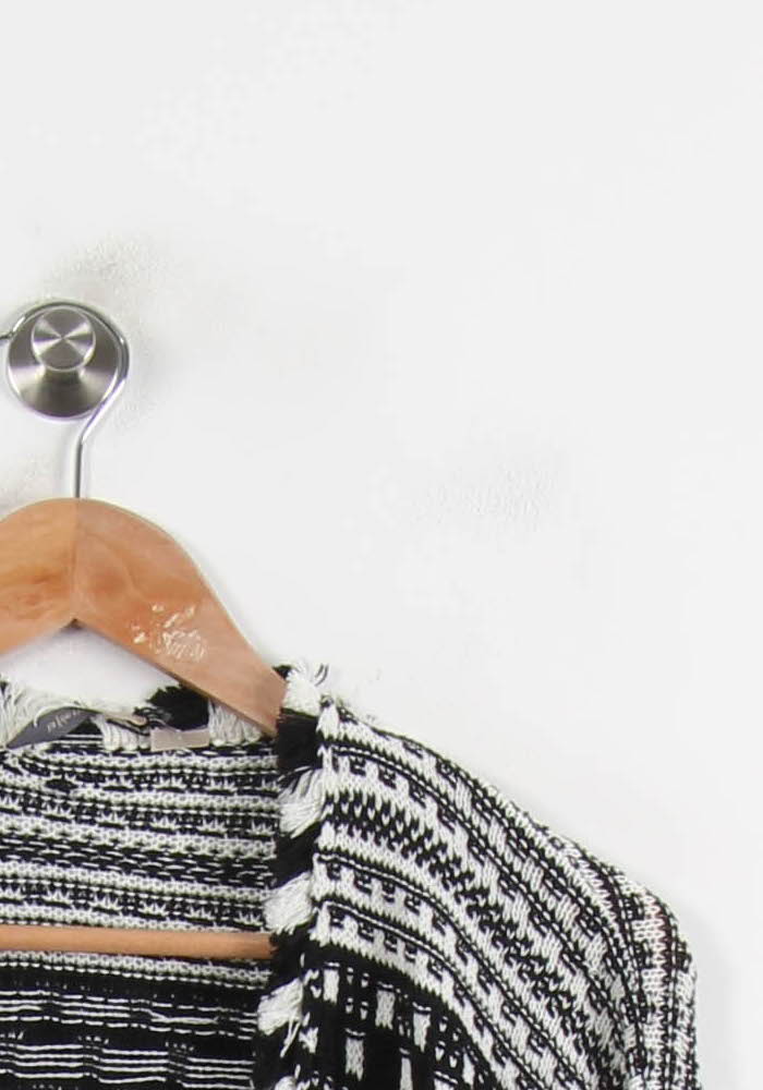 Cardigan noir à motifs graphiques La Fée Maraboutée, taille S/36, une pièce élégante et originale de la marque reconnue pour son raffinement. Ce cardigan en maille présente un motif jacquard noir et blanc, avec des finitions en bord-côte noir et une coupe ample, apportant une touche bohème et authentique à la silhouette. Idéal pour réchauffer une tenue lors d’une sortie décontractée ou pour ajouter une note sophistiquée à un look de bureau.