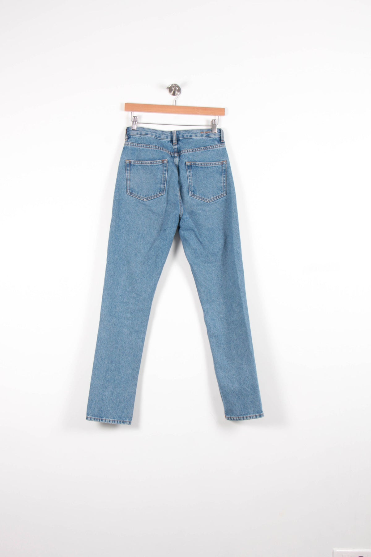 Jean droit bleu Des Petits Hauts, taille S/36, une pièce incontournable et élégante signée par la marque. Confectionné dans une toile denim bleu clair, il se distingue par une coupe droite et une allure intemporelle, complétée de détails classiques comme les poches plaquées et une fermeture à bouton métallique, pour un look authentique et soigné. Ce jean sera parfait pour une journée décontractée en ville ou un vendredi au bureau, associé à une chemise blanche et des mocassins.