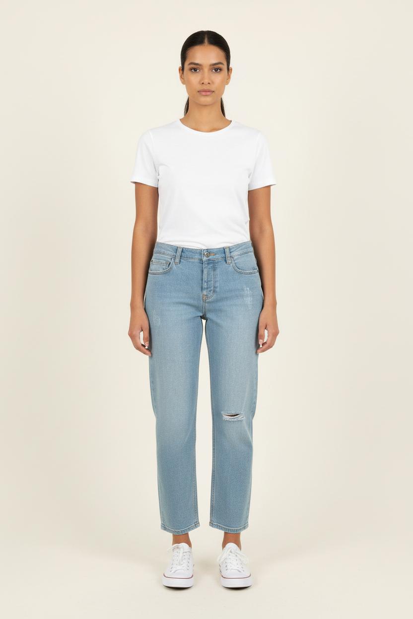 Jean bleu droit Bérénice, taille M/38, arborant un style décontracté et contemporain. Confectionné dans une toile denim bleu clair, ce pantalon présente des effets légèrement usés et une petite déchirure discrète sur la jambe, lui conférant un caractère moderne et authentique. Idéal pour une sortie citadine ou une journée décontractée entre amis.