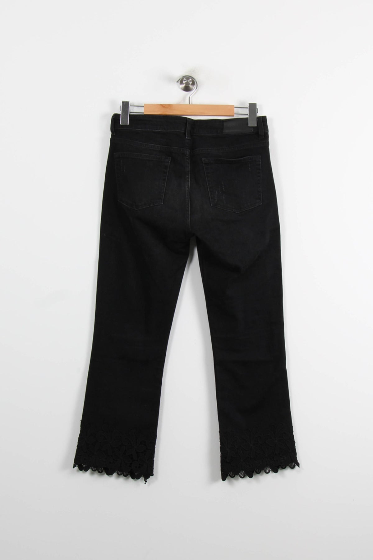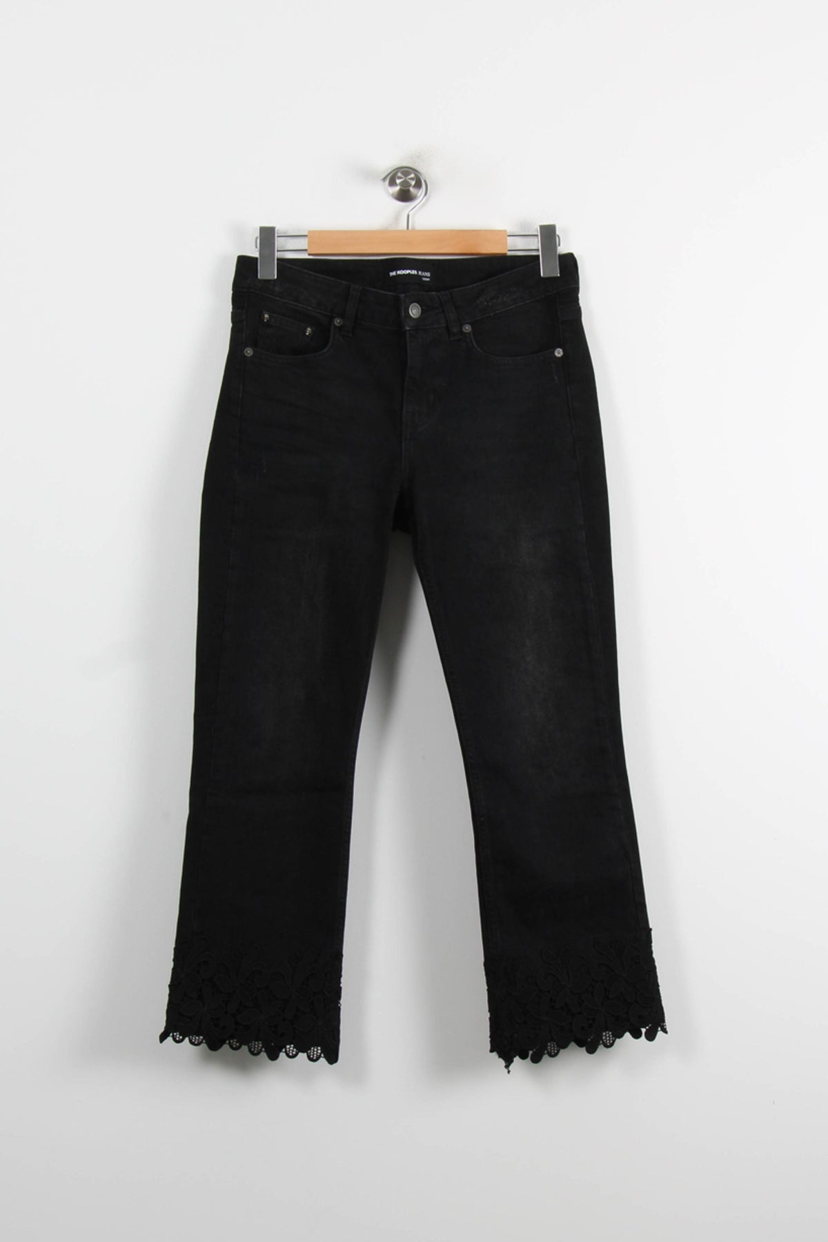 Jean noir The Kooples en taille M/38, au design moderne et élégant. Confectionné dans une matière denim de qualité, ce pantalon se distingue par ses finitions délicates en dentelle ajourée sur le bas des jambes, apportant une touche sophistiquée et féminine. Idéal pour un dîner en ville ou une soirée habillée, associé à une blouse et des escarpins.