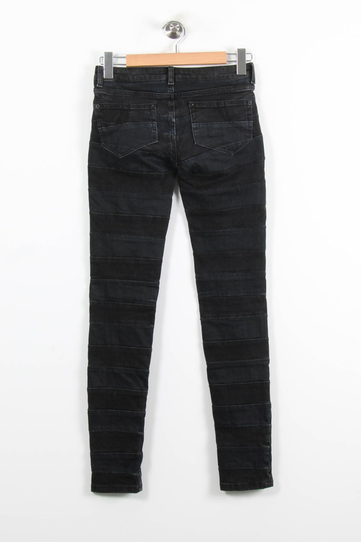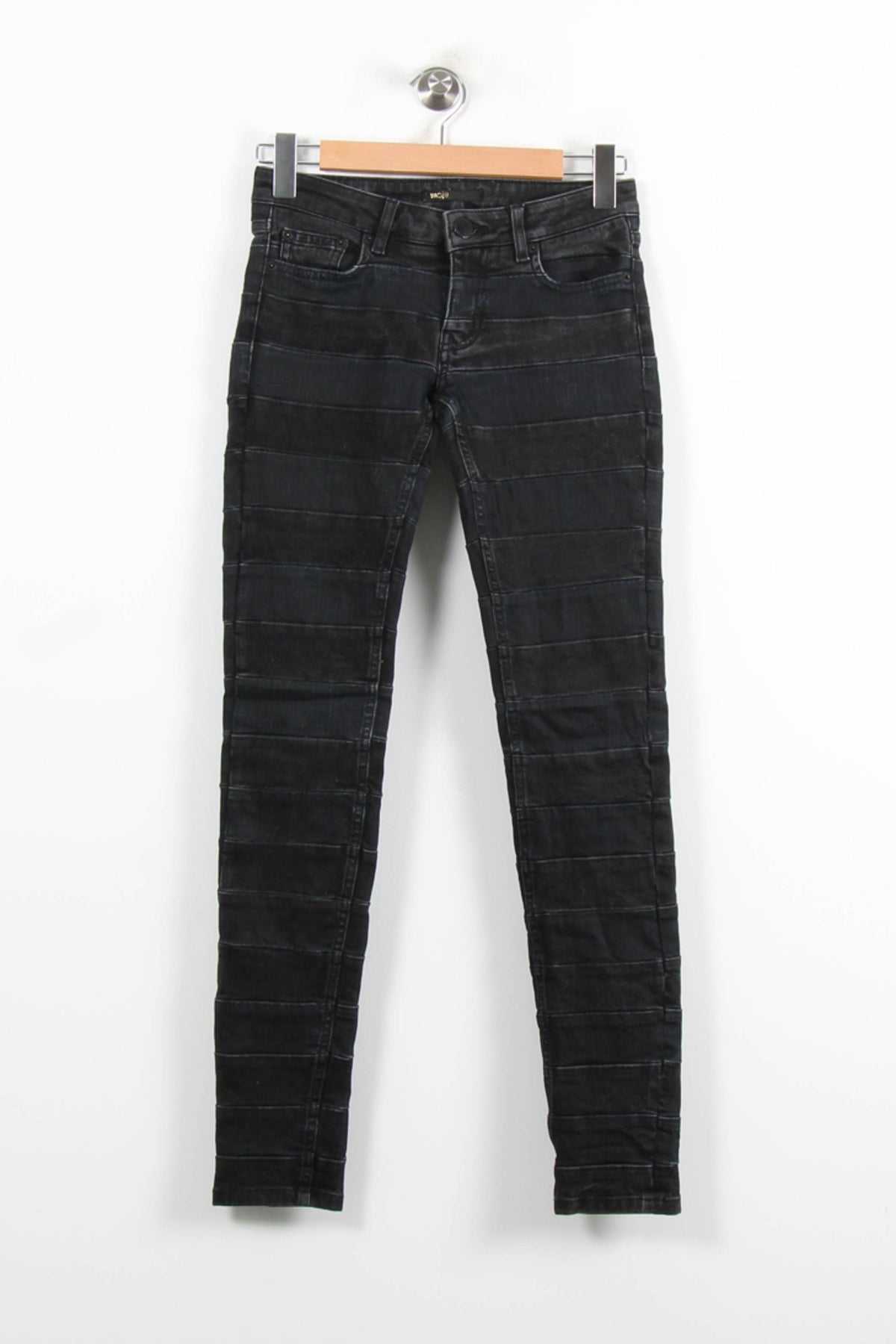 Jean skinny noir Maje, taille XS/34, un modèle contemporain à la coupe ajustée mettant en valeur la silhouette. Confectionné dans une matière denim de qualité, il se distingue par ses surpiqûres horizontales qui apportent une touche graphique et originale à l’ensemble. Idéal pour une soirée décontractée ou pour apporter une note élégante à une tenue urbaine.