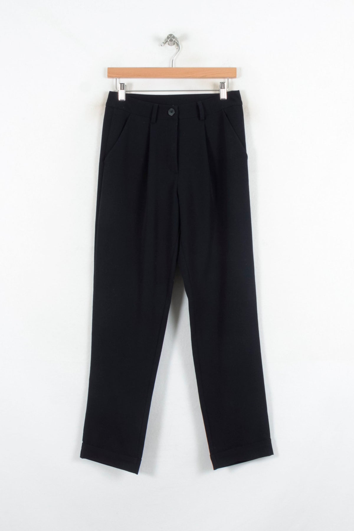 Pantalon bleu La Fée Maraboutée, taille M/38, coupe classique avec fermeture boutonnée. Confectionné dans une matière fluide et élégante, il se distingue par ses plis à l’avant, ses poches latérales et ses ourlets légèrement retroussés, contribuant à une allure soignée et moderne. Ce pantalon est idéal pour une journée de travail ou une sortie citadine où confort et raffinement sont de mise.